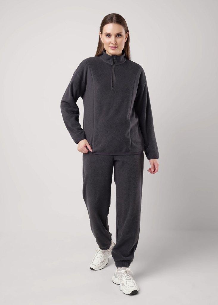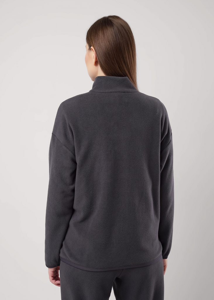 Джемпер спортивный прямого силуэта из трикотажного полотна флис. По горловине стойка с молнией. Спереди рельефы. Длинный рукав со спущенной линией плеча. По низу рукава и низа изделия окантовка. Спереди вышивка.