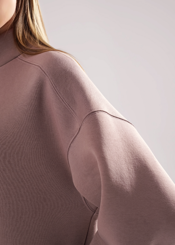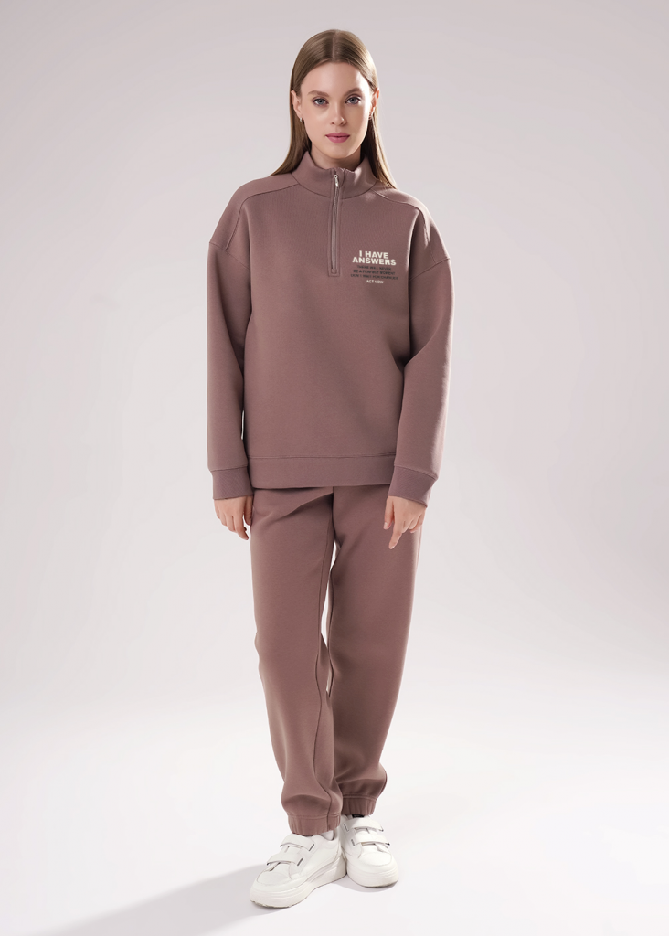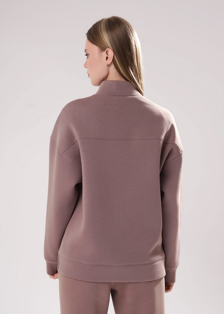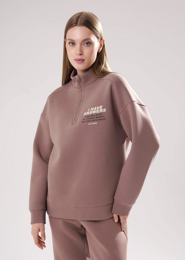 Джемпер спортивный из трикотажного полотна футер с начесом, свободного кроя. Длинный рукав со спущенной линией плеча. По горловине стойка с застежкой на молнию. По спинке кокетка. По низу рукава и изделия манжет. Спереди принт.