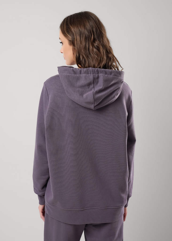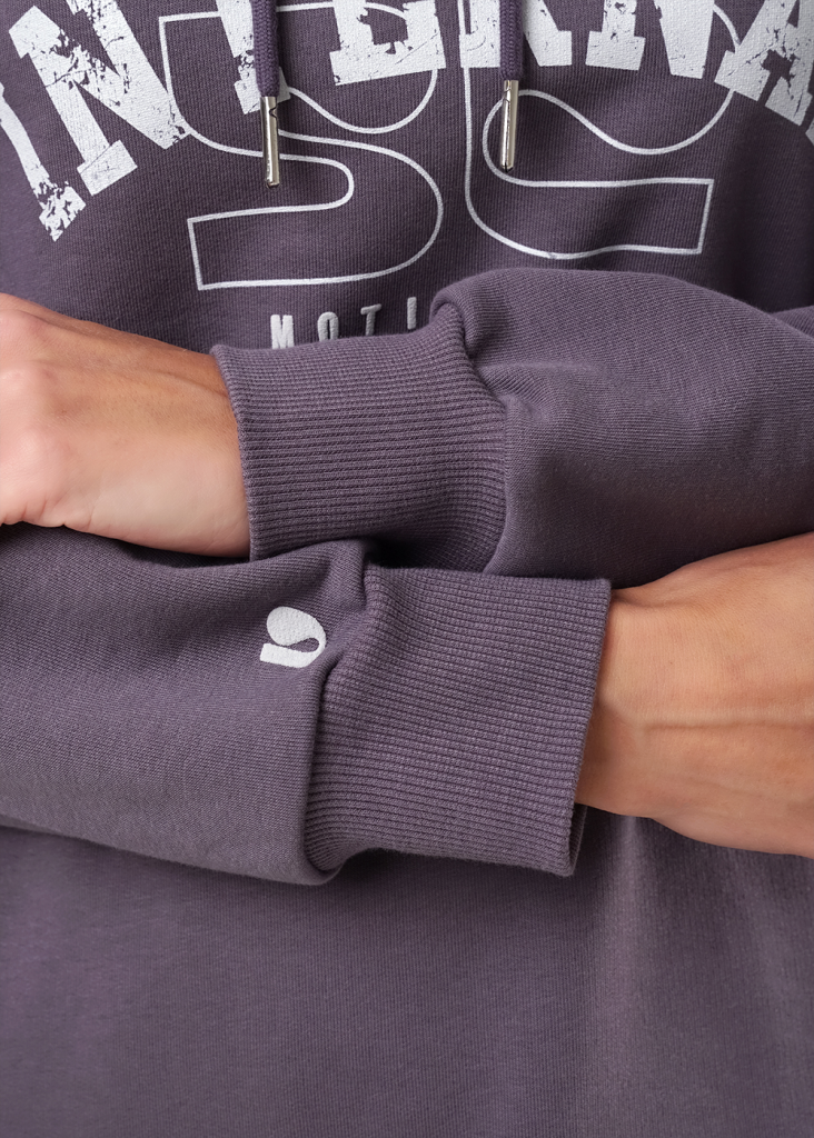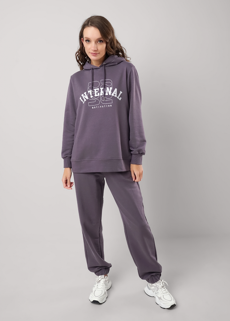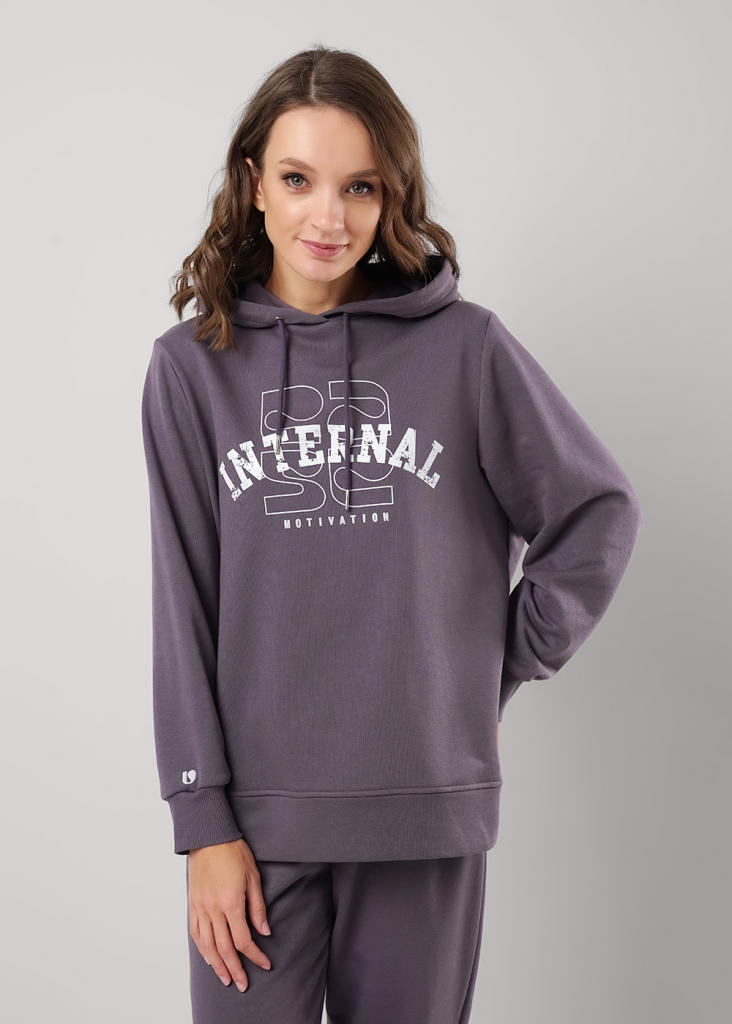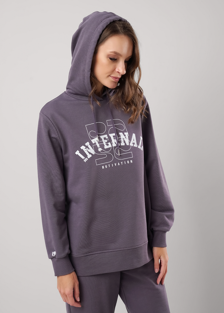 Джемпер для спорта и отдыха из футера 3х нитки с хлопком в составе. Капюшон двойной со шнуром. Длинный рукав со спущенной линией плеча. По низу рукавов манжеты из кашкорсе. На полочке принт вспенка, по низу рукава принт.