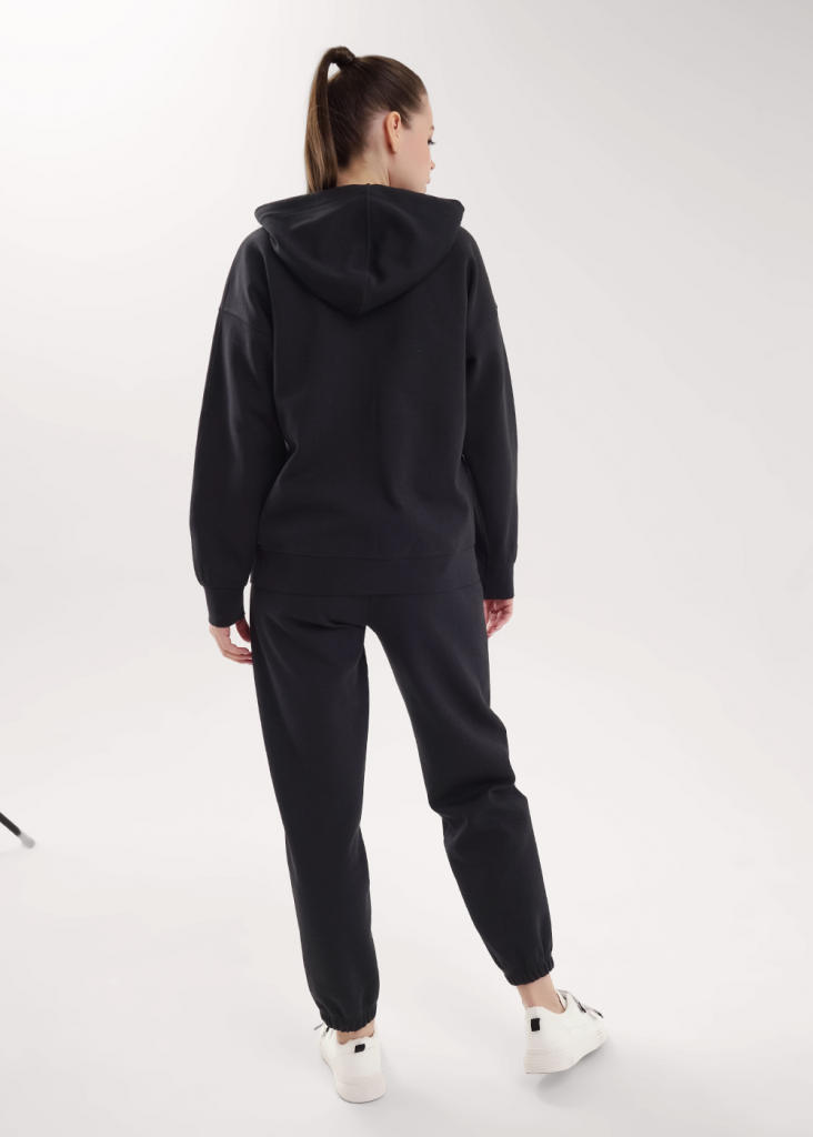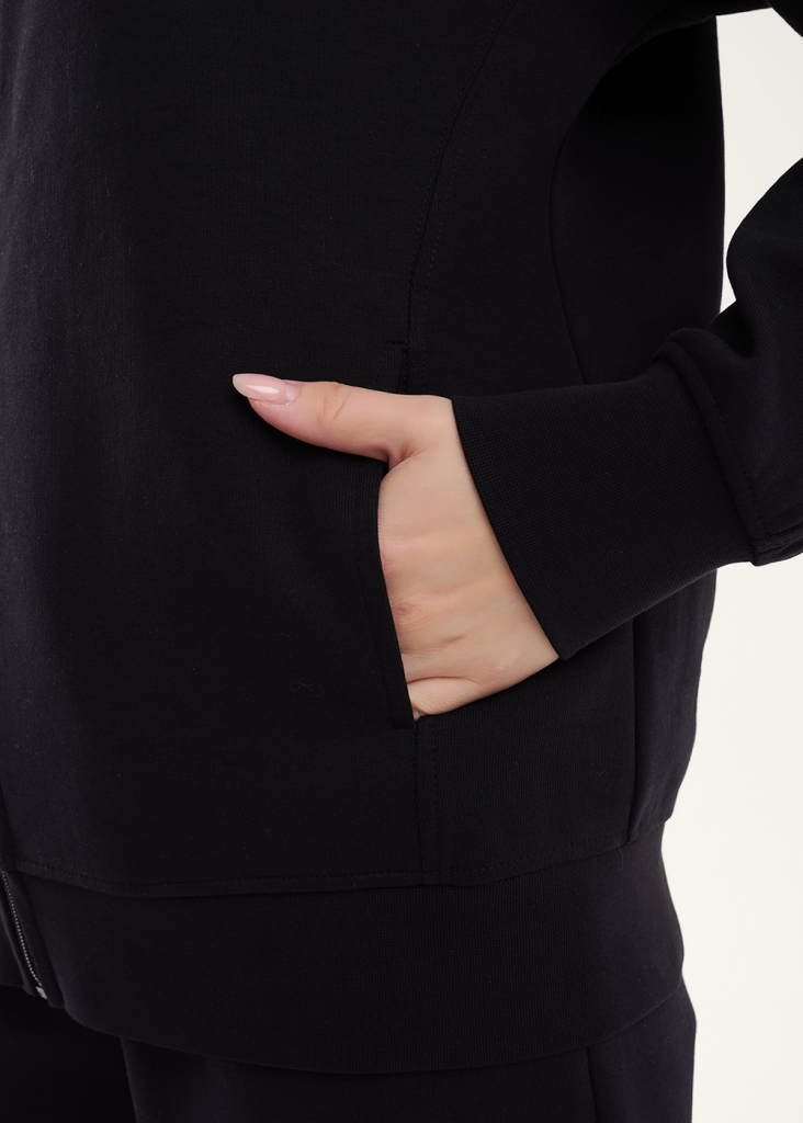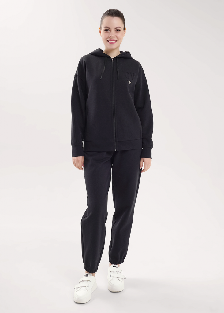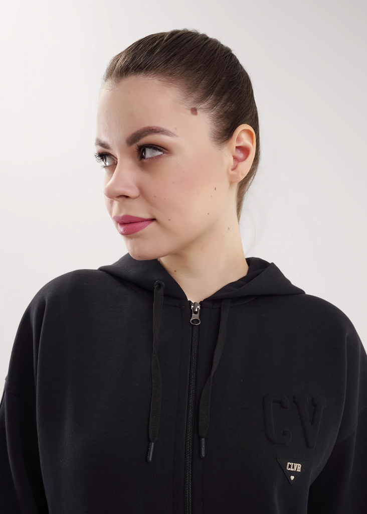 Куртка спортивная из трикотажного полотна,на молнии.По горловине капюшон со шнуром,Спущенная линия плеча,длинный рукав,внизу принт.По низу рукава,изделия манжет из кашкорсе.По переду и рукаву отстроченные резы,карманы в шве.На полочке гофропринт,нашивка
