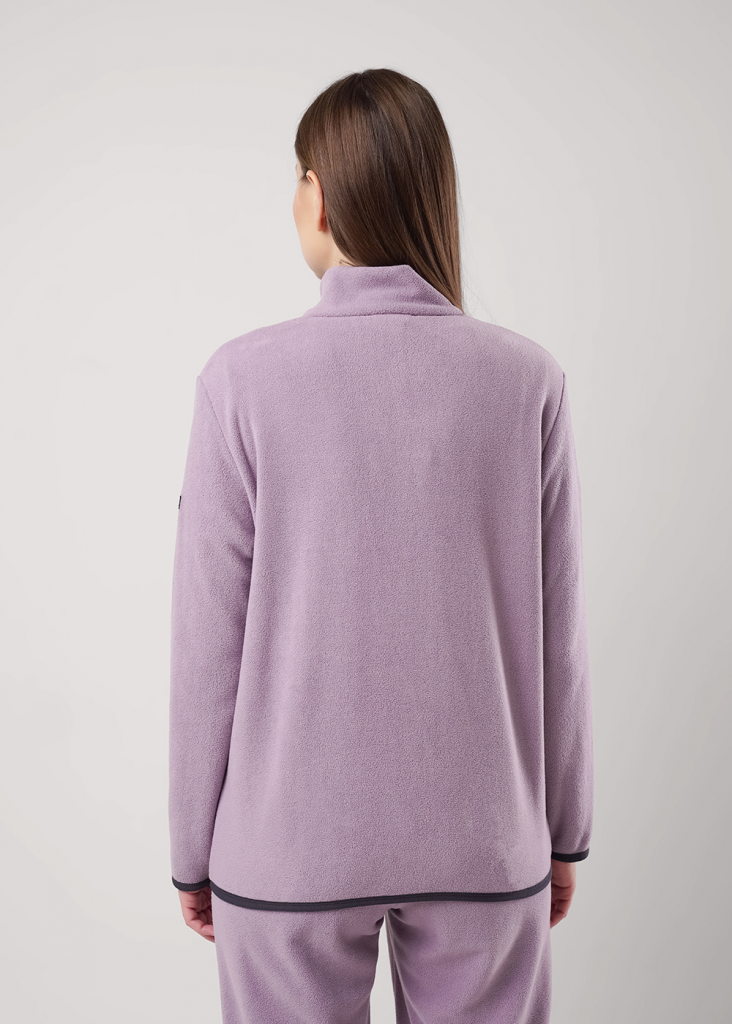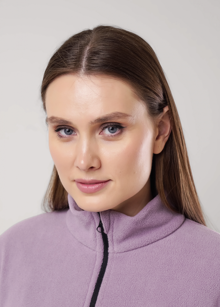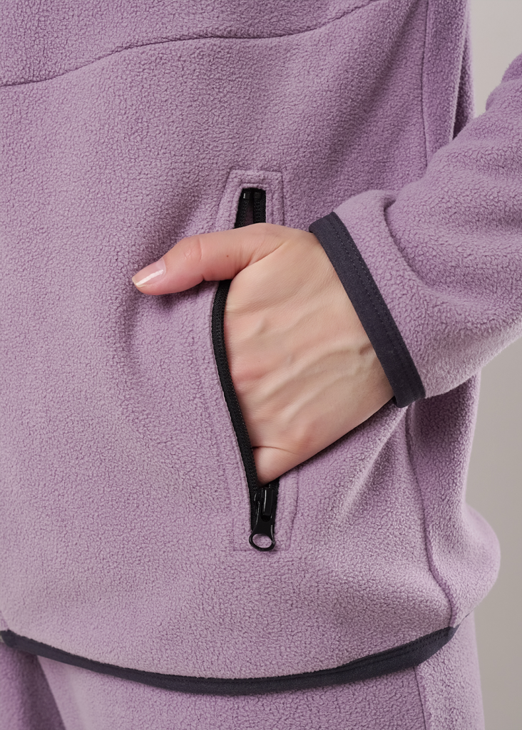 Куртка спортивная прямого силуэта из трикотажного полотна флис, на молнии. По горловине стойка. Спереди горизонтальный рез, карманы на молнии. Длинный рукав со спущенной линией плеча, нашивка.По низу рукава и низа изделия окантовка. Спереди вышивка.