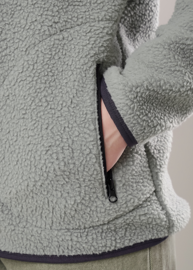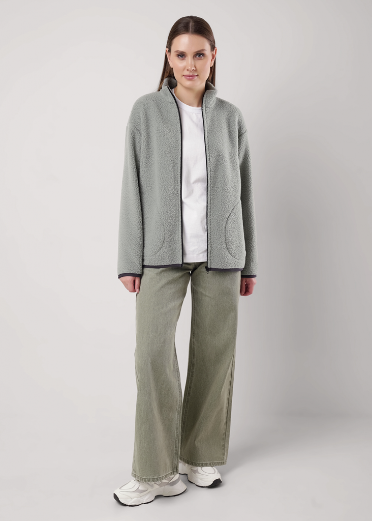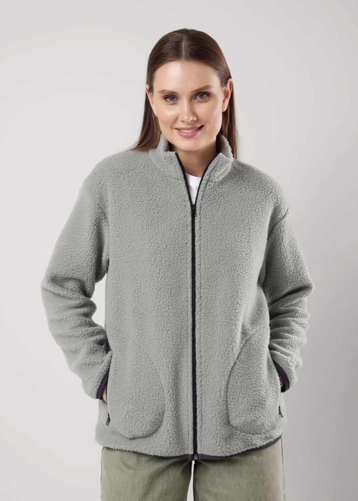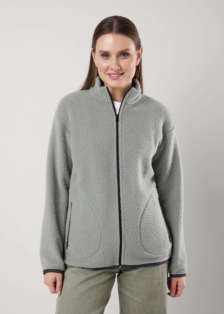 Куртка спортивная из трикотажного полотна велсофт, на молнии. По горловине стойка. Спереди карманы на молнии с закреплением мешковины. Длинный рукав со спущенной линией плеча, нашивка. По низу рукава и низа изделия окантовка.