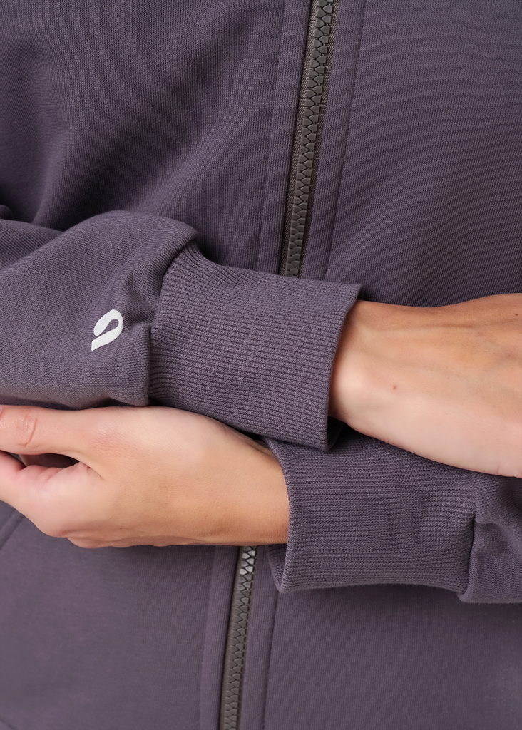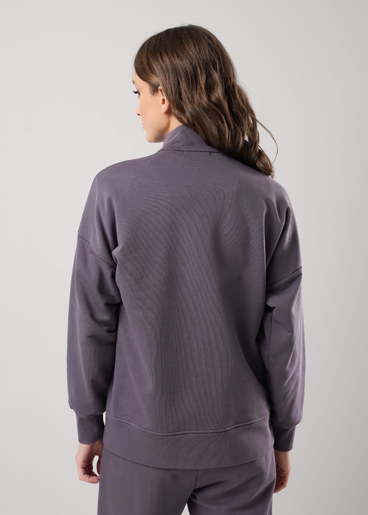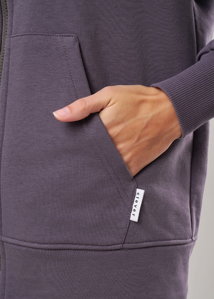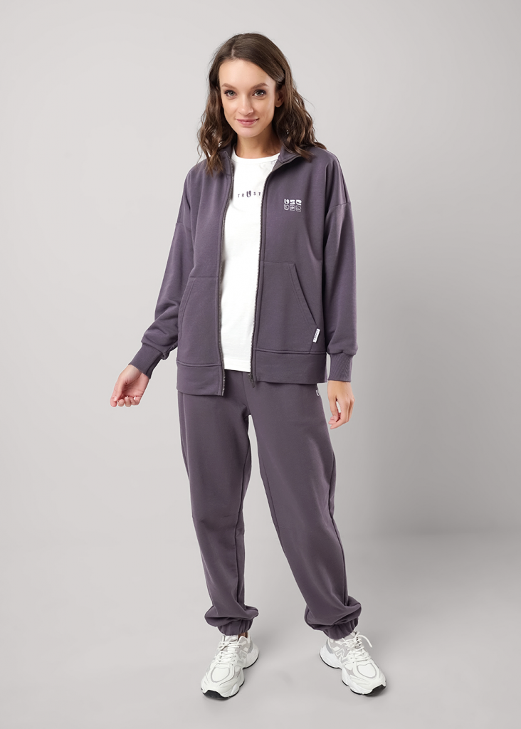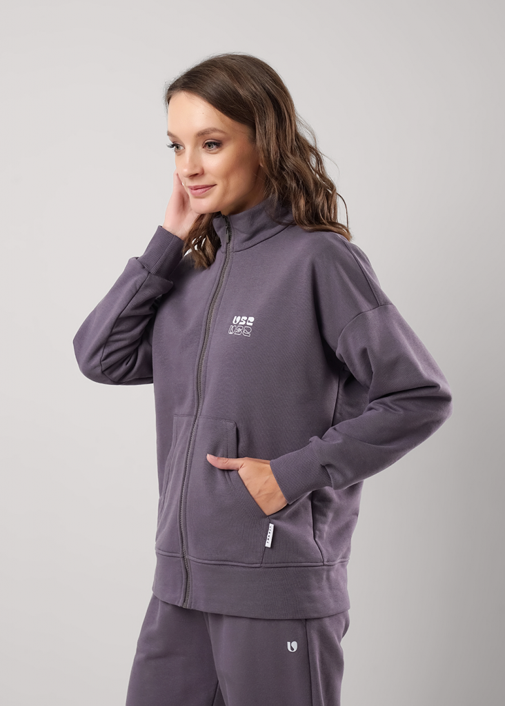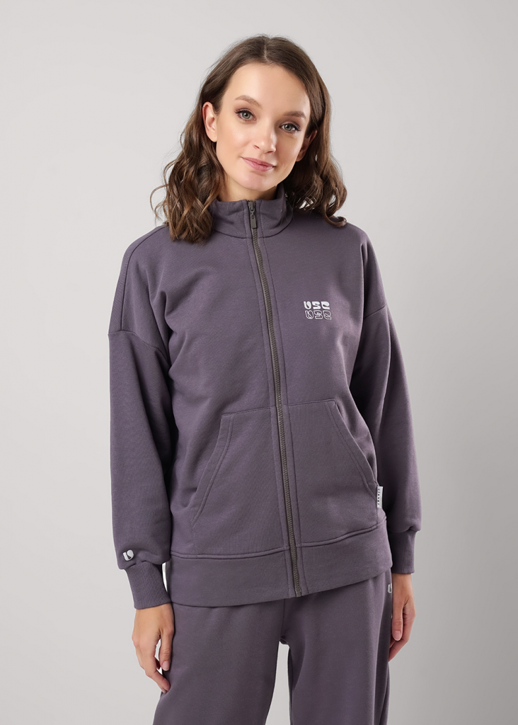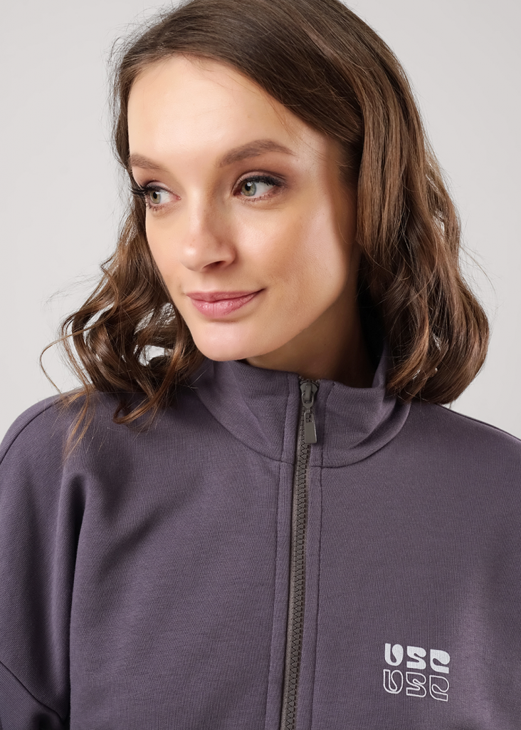 Куртка на молнии для спорта и отдыха из футера 3х нитки с хлопком в составе. По горловине стойка. Длинный рукав со спущенной линией плеча. По низу рукавов манжеты из кашкорсе. Спереди карманы-кенгуру, вшивка. На полочке и низу рукава принт вспенка.