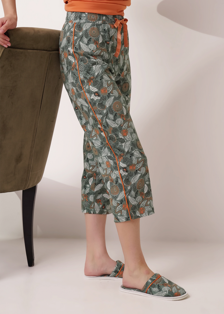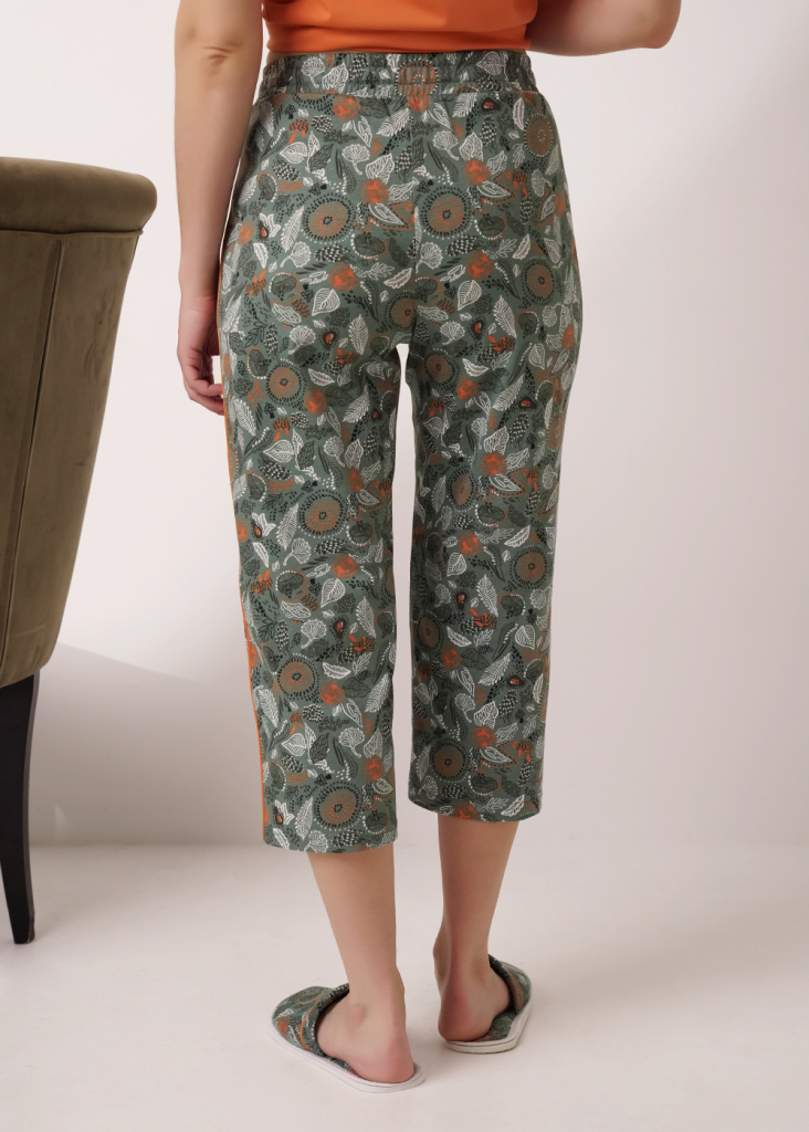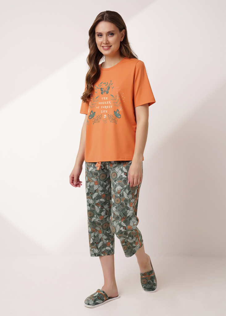 Набор одежды для дома и отдыха из хлопкового трикотажного полотна. Футболка прямого силуэта, короткий втачной рукав. В боковом шве вшивка. Спереди принт. Бриджы по талии пояс на внутренней резинке с атласной лентой. По боковым швам атласный кант.