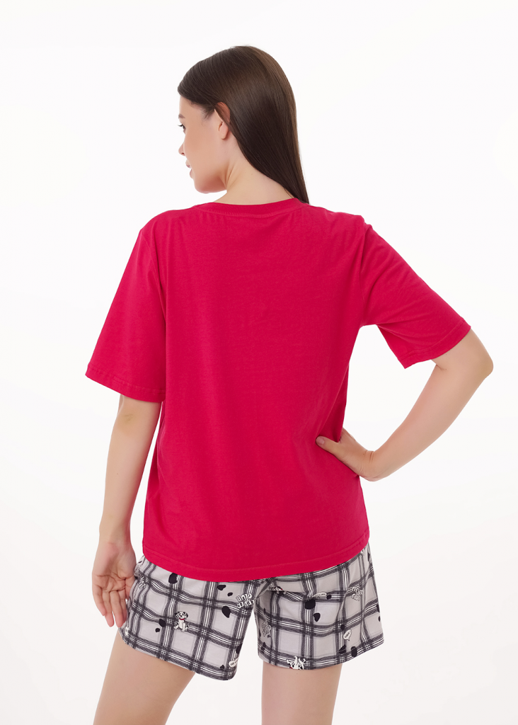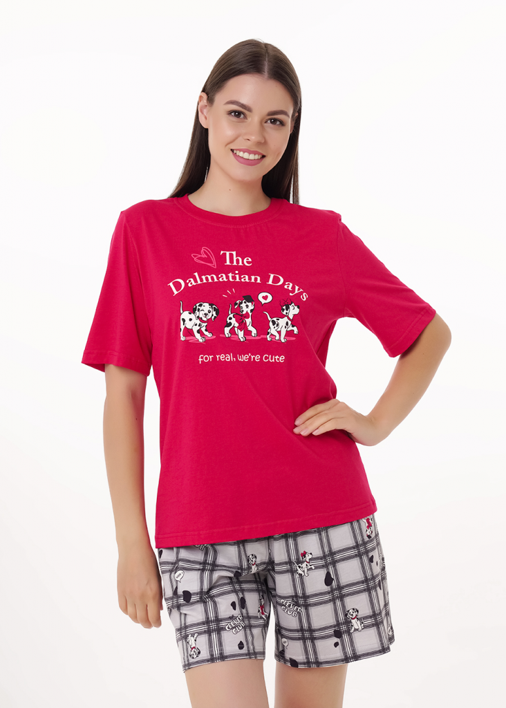 Набор одежды из хлопкового трикотажного полотна. Футболка прямого кроя, короткий втачной рукав, округлая горловина с обтачкой. Спереди принт. Шорты с поясом на внутренней резинке. Спереди имитация гульфика с пуговицами Боковые карманы с отрезным бочком.