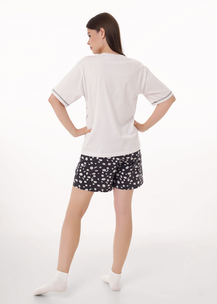 Набор одежды из трикотажного полотна. Футболка прямого кроя. Короткий втачной рукав, по низу рукава застил. Округлая горловина с обтачкой. Спереди резы с застилом,принт. Шорты с поясом на внутренней резинке. Боковые карманы с отрезным бочком,нашивка.