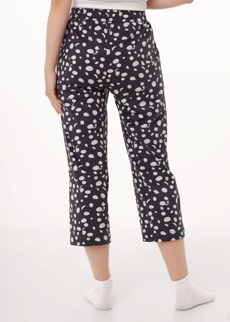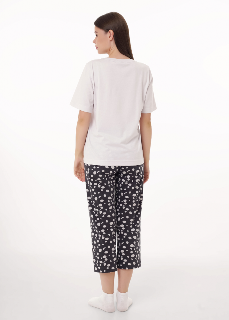 Набор одежды из хлопкового трикотажного полотна. Футболка прямого кроя, короткий втачной рукав, округлая горловина с обтачкой. Спереди принт. Внизу нашивка. Бриджи с поясом на внутренней резинке. Боковые карманы с отрезным бочком.