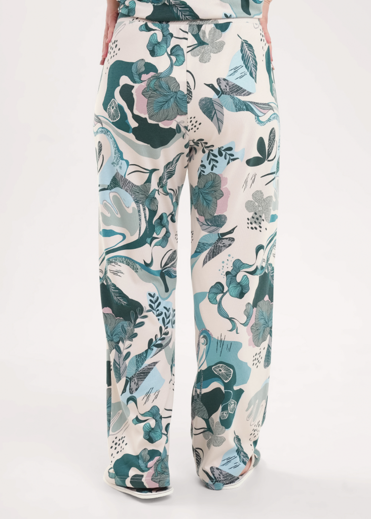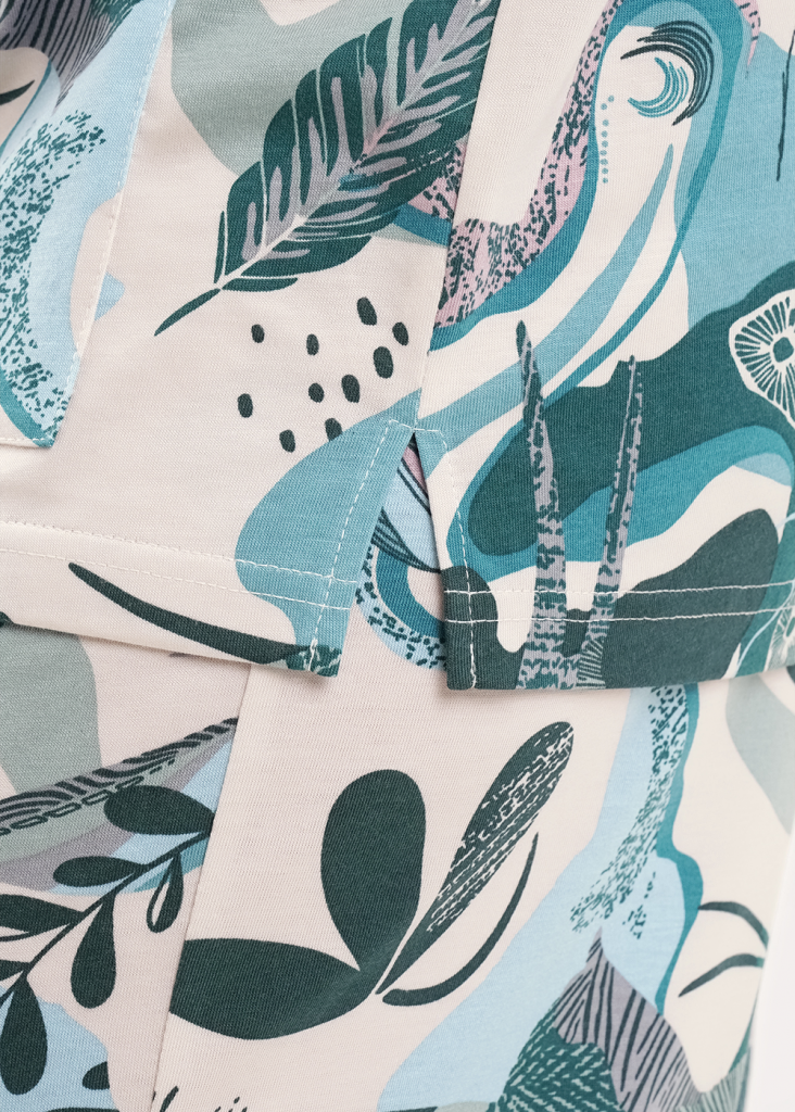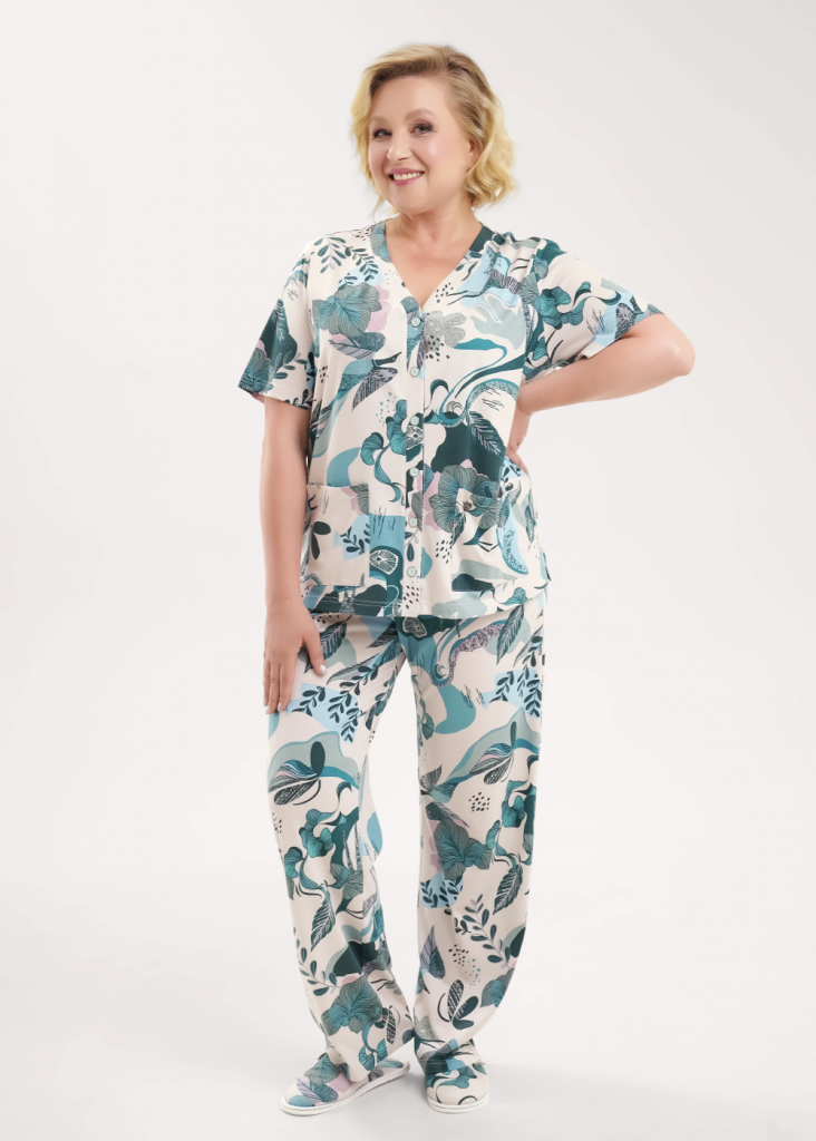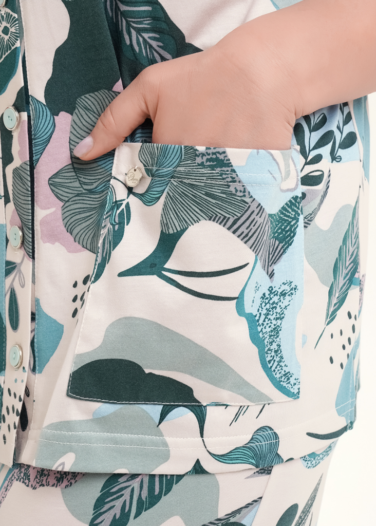 Пижама из трикотажного полотна с модалом. Джемпер по горловине и борту обтачка с застежкой на пуговицы, накладные карманы, нашивка металл. Короткий втачной рукав. Боковые разрезы. Брюки с поясом на внутренней резинке. Боковые карманы с отрезным бочком.