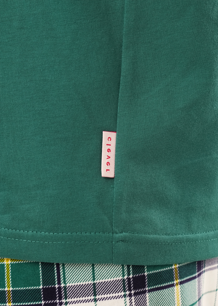Пижама из хлопкового трикотажного полотна. Футболка прямого кроя. Короткий втачной рукав. Округлая горловина с обтачкой. Спереди принт. В боковом шве вшивка. Брюки из трикотажного полотна с карбоном прямые, пояс на внутренней резинке с киперной лентой.