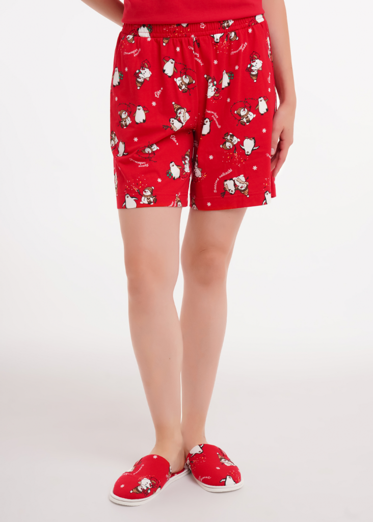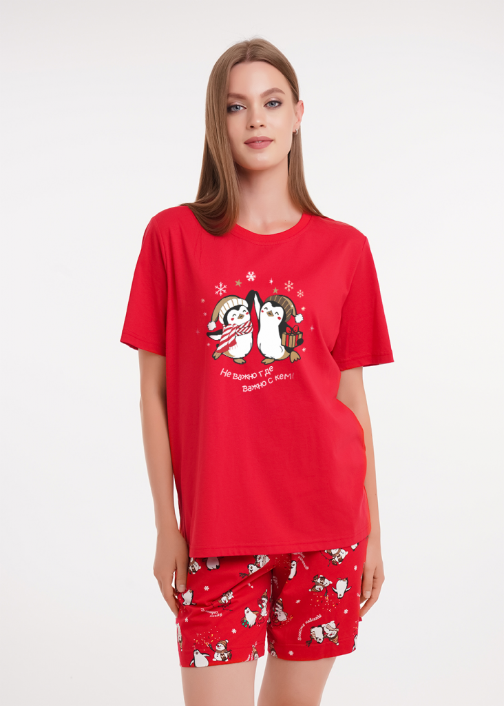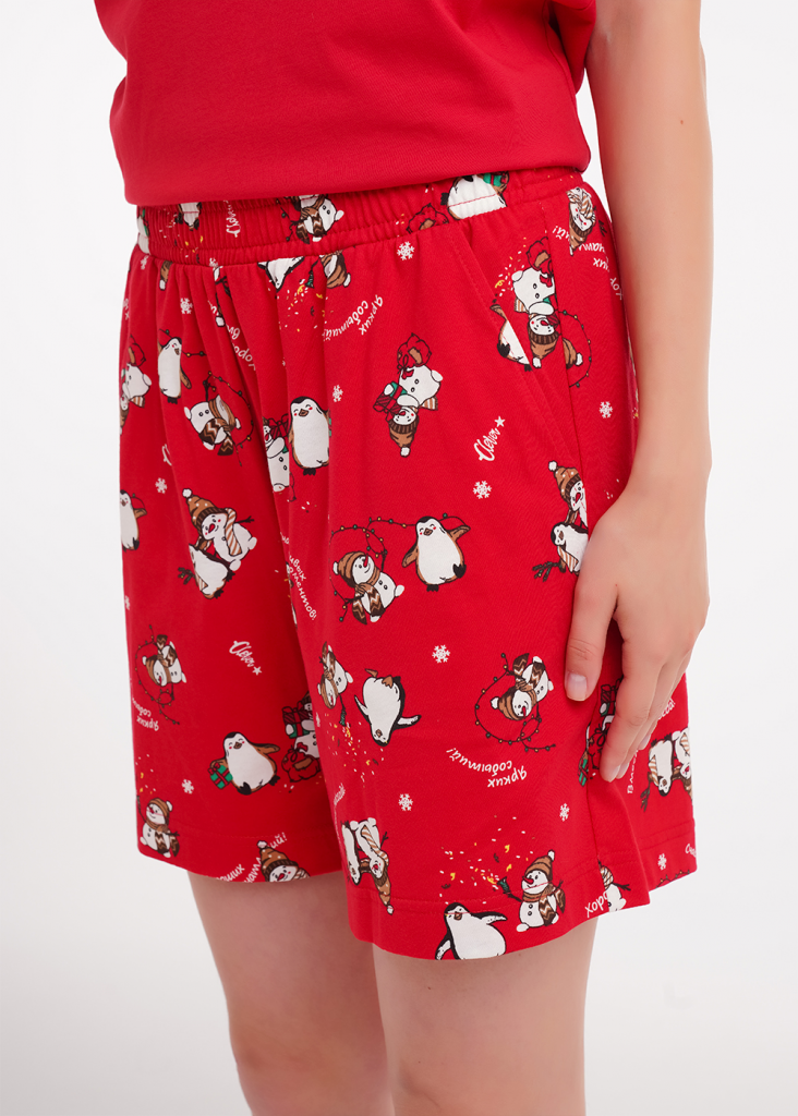 Набор одежды из хлопкового трикотажного полотна. Футболка прямого кроя. Короткий втачной рукав, нашивка. Округлая горловина с обтачкой. Спереди принт. Шорты с поясом на внутренней резинке. Боковые карманы с отрезным бочком.