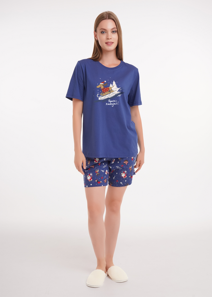 Набор одежды из хлопкового трикотажного полотна. Футболка прямого кроя. Короткий втачной рукав, нашивка. Округлая горловина с обтачкой. Спереди принт с пришивным помпоном. Шорты с поясом на внутренней резинке. Боковые карманы с отрезным бочком.