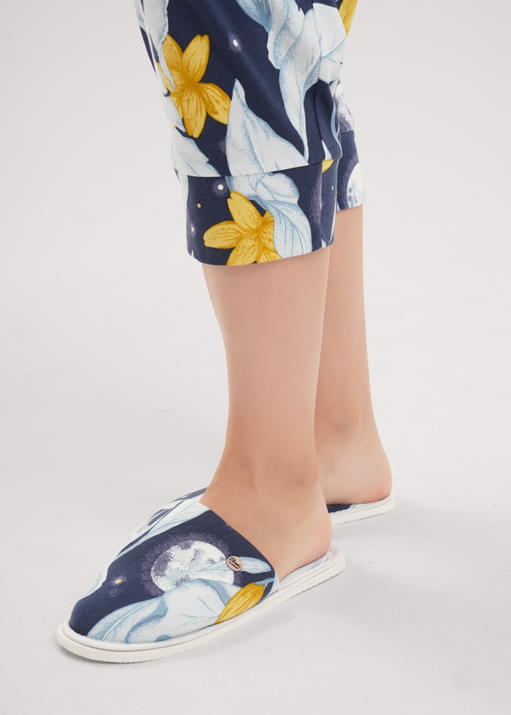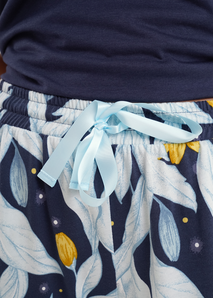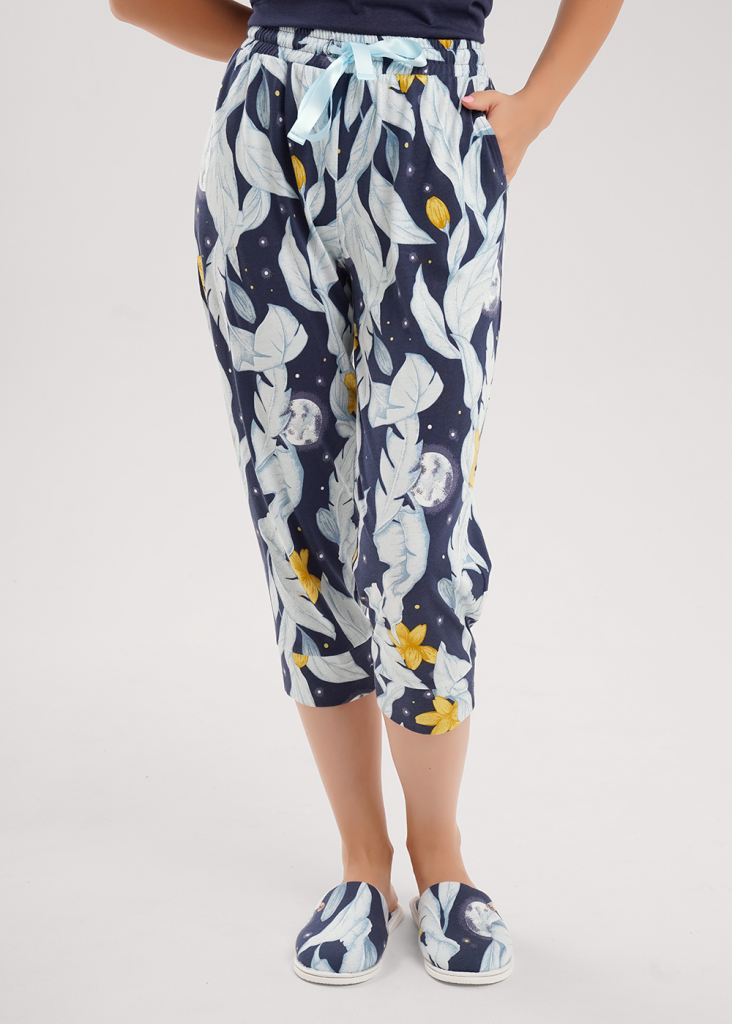 Набор одежды из хлопкового трикотажного полотна с модалом. Футболка с коротким цельнокроеным рукавом, по низу узкий манжет. По горловине обтачка. Спереди принт. Бриджи с поясом на резинке,атласной лентой. Боковые карманы с отрезным бочком. Внизу манжет.