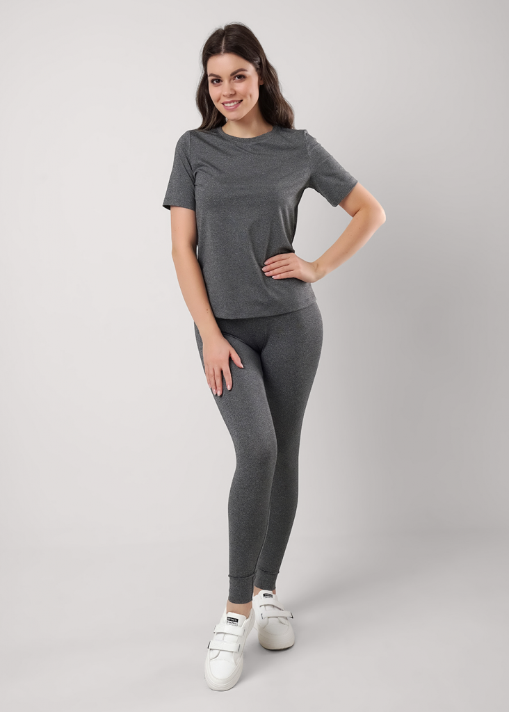 Комплект для спорта из плотного эластичного трикотажного полотна. Джемпер прямого силуэта. Короткий втачной рукав, округлая горловина с обтачкой. Лосины с широким двойным поясом на внутренней резинке.