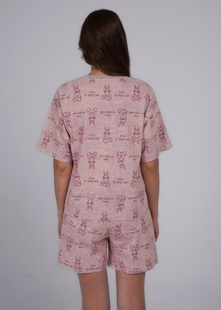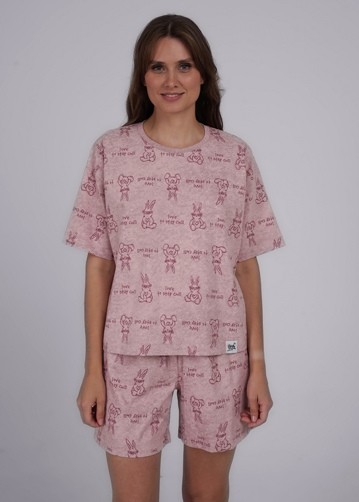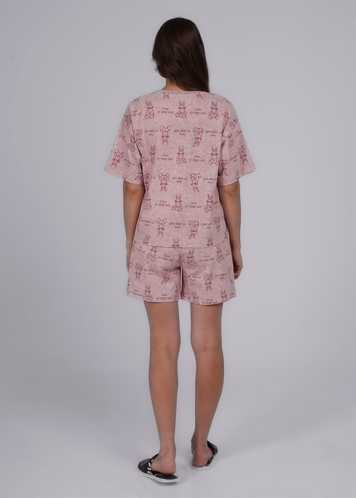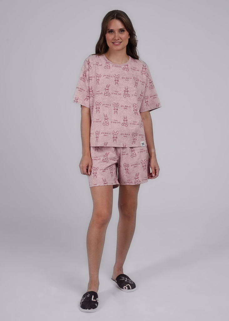 Пижама для дома из плотного хлопкового трикотажного полотна. Футболка прямого силуэта. Округлая горловина с обтачкой. Втачной короткий рукав. Спереди внизу нашивка. Шорты с поясом на внутренней резинке.