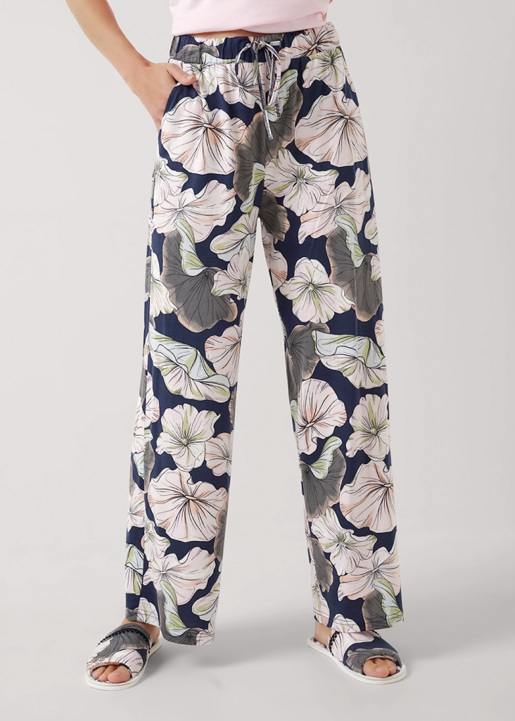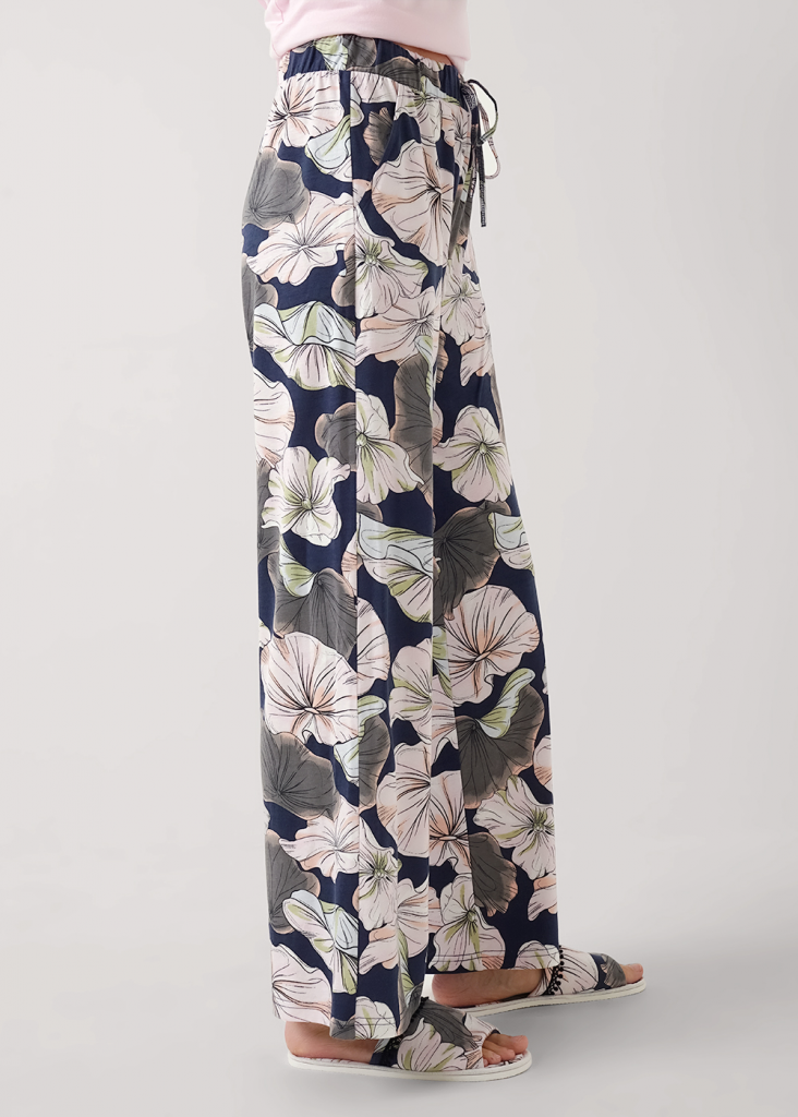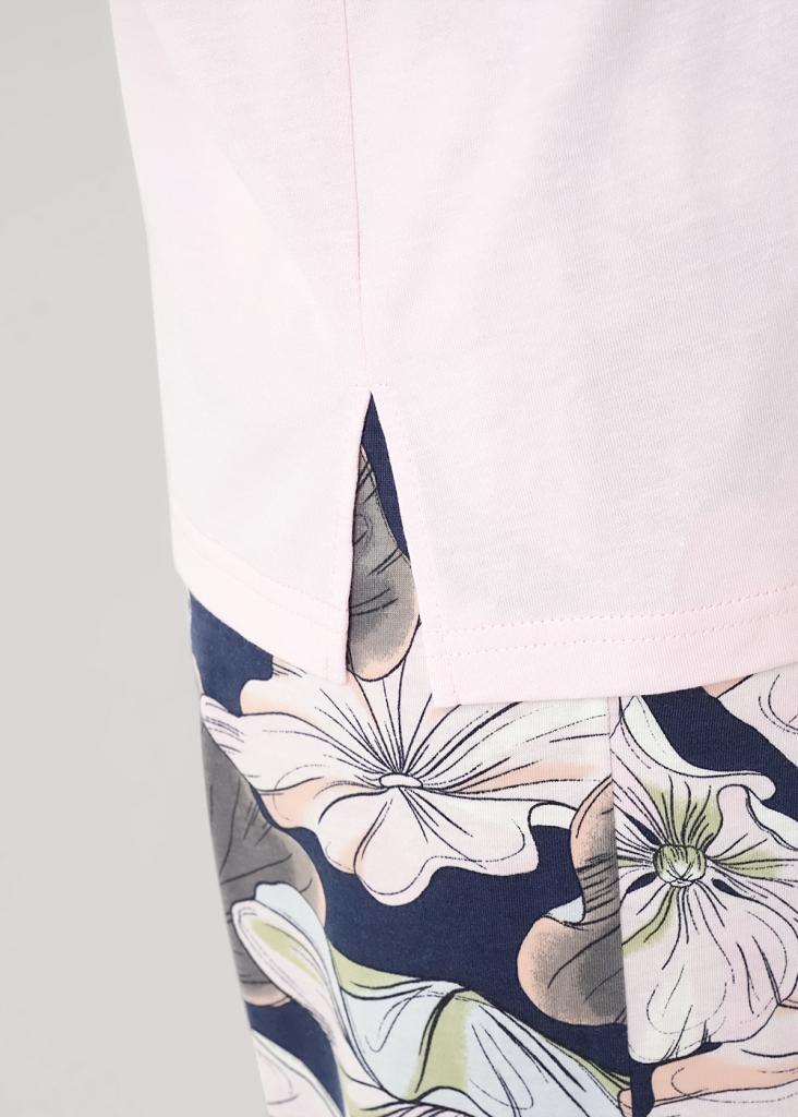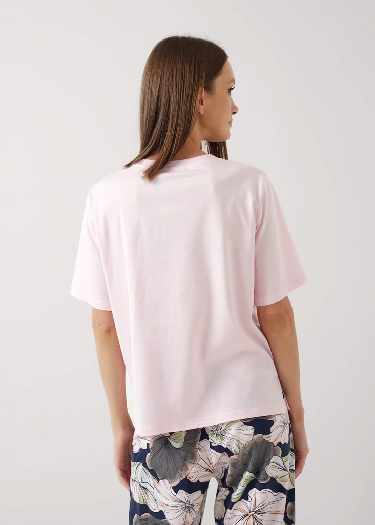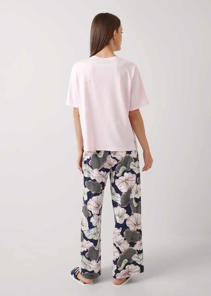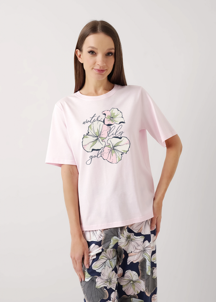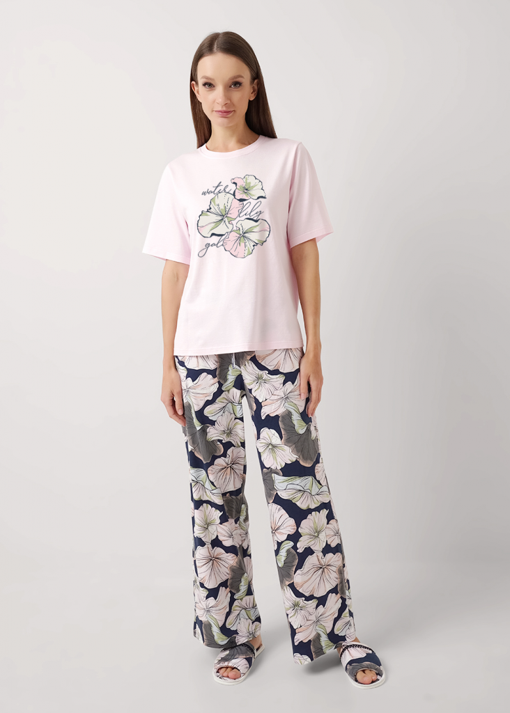 Пижама для дома из трикотажного полотна с добавлением модала. Футболка прямого силуэта.Округлая горловина с обтачкой,короткий втачной рукав.По бокам разрезы,принт.Широкие брюки с поясом на внутренней резинке с завязками.Боковые карманы с отрезным бочком.