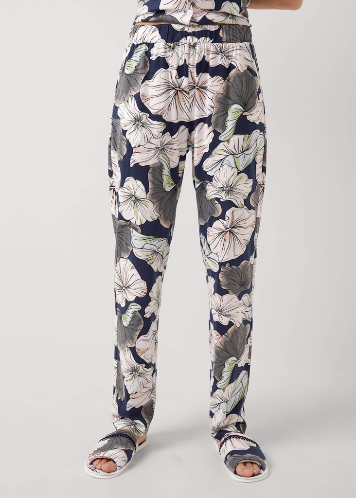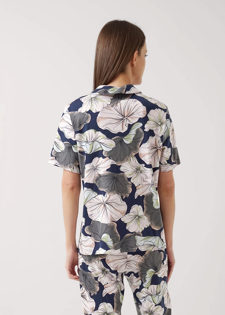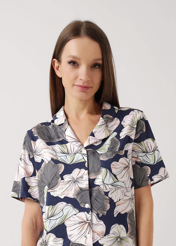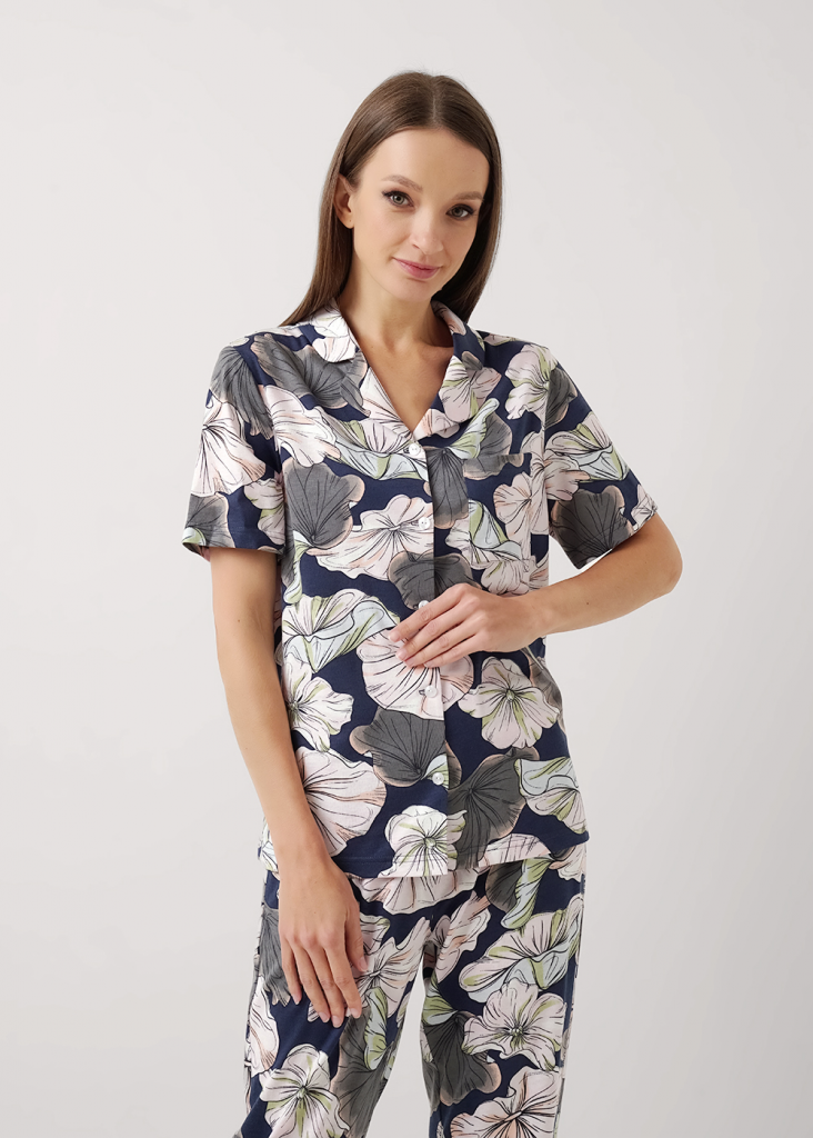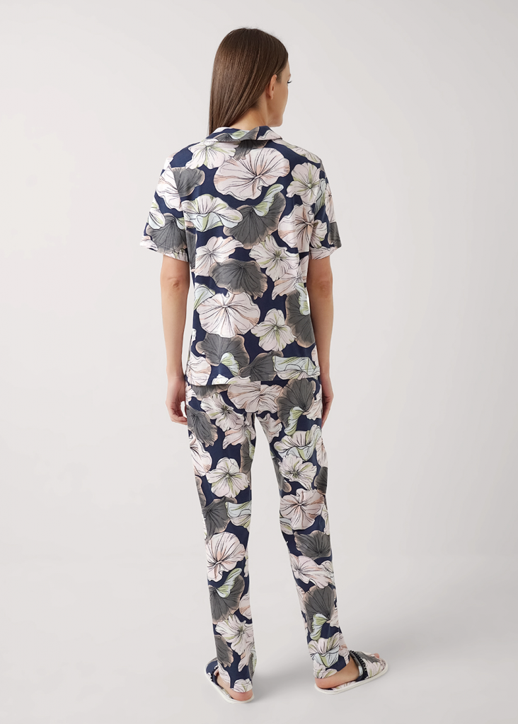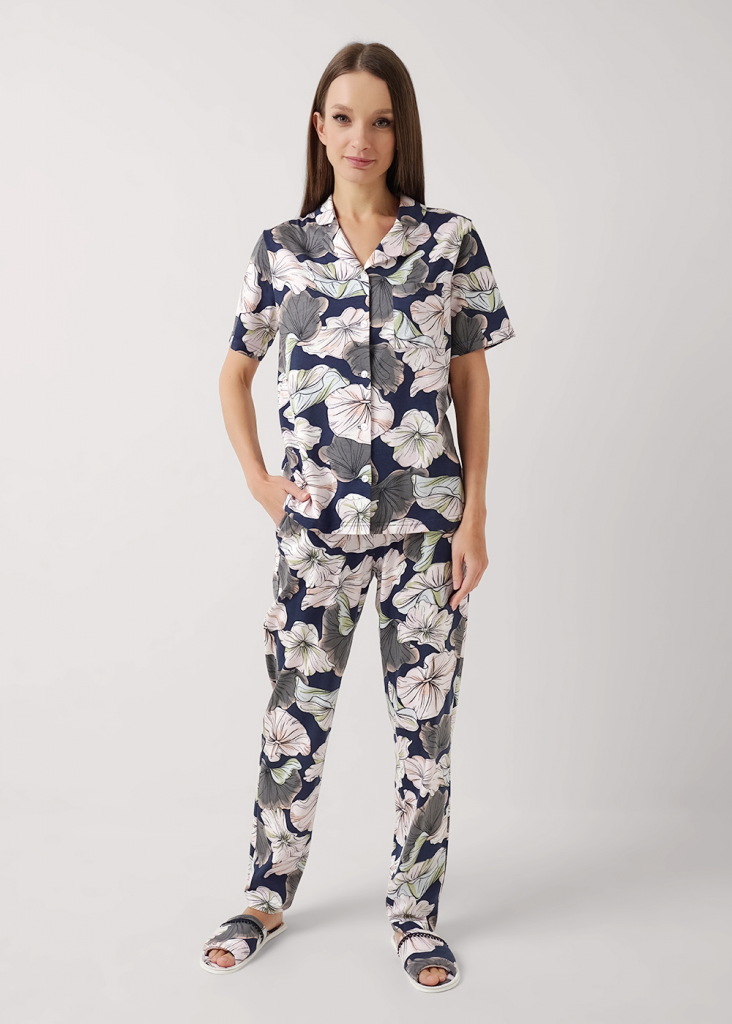 Пижама для дома из трикотажного полотна с добавлением модала. Джемпер с застёжкой на пуговицы, отложной воротник с лацканами. Спереди накладной карман с контрастным кантом. Прямые брюки с поясом на внутренней резинке. Боковые карманы с отрезным бочком.