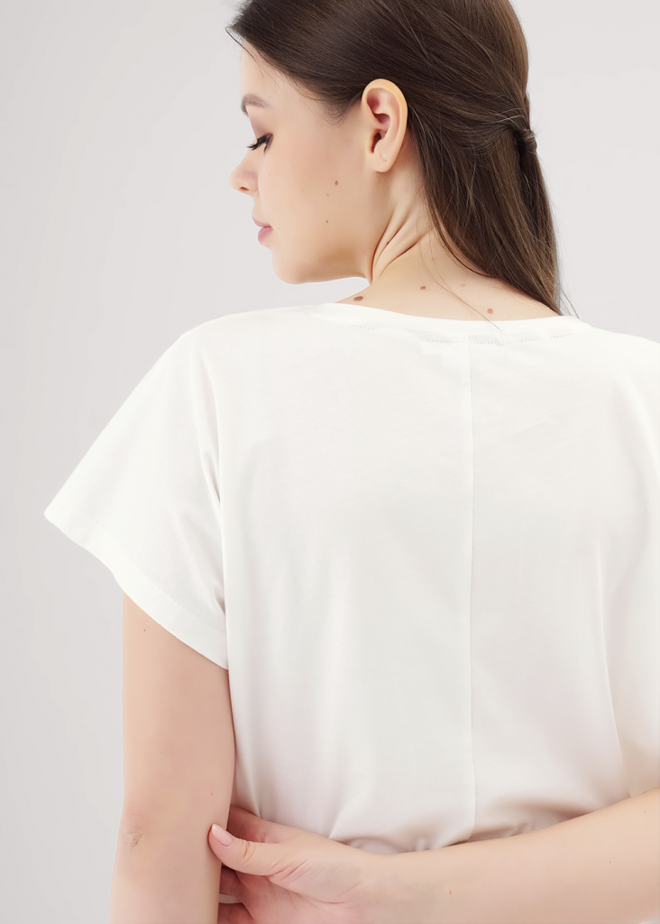 Пижама из трикотажного полотна.Футболка прямого силуэта,короткий цельнокроеный рукав.Округлая горловина с обтачкой.Спереди принт.Сзади средний шов.Боковые разрезы.Брюки с притачным поясом на резинке,шнуром из окантовки.Боковые карманы с отрезным бочком.,