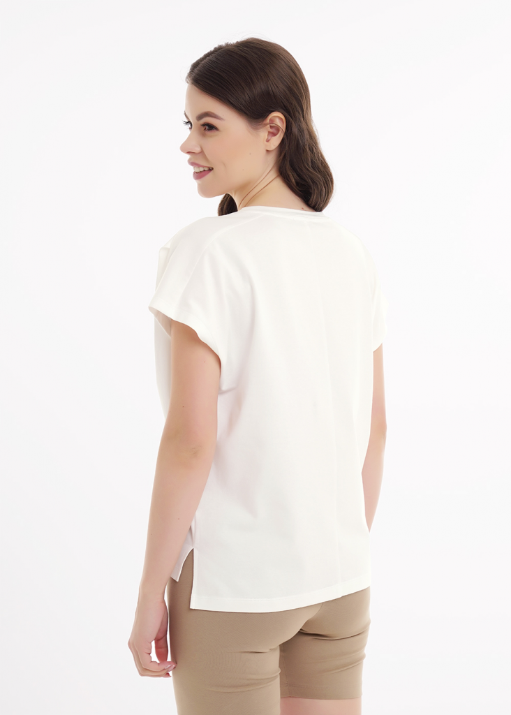 Набор одежды для дома и отдыха из трикотажного полотна.Футболка прямого кроя, горловина с обтачкой.Короткий цельнокроенный рукав,по плечу складки.Спереди и на плече принт,боковые разрезы.Сзади средний шов.Шорты с поясом на резинке,теромонаклейка силикон.