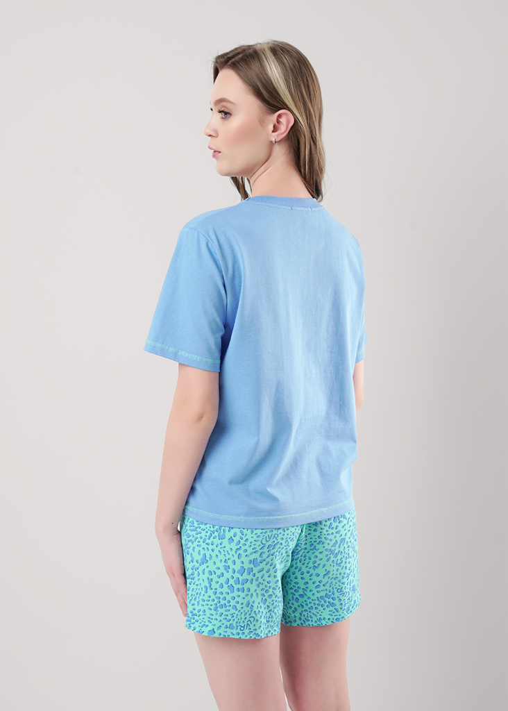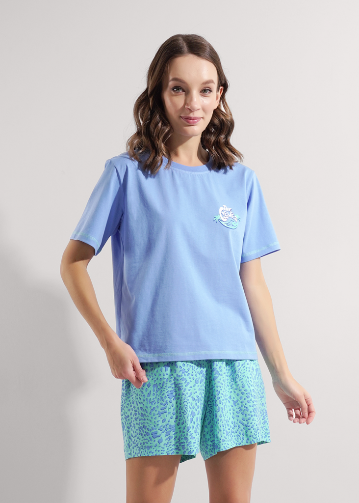 Набор одежды для дома и отдыха из трикотажного полотна.Футболка прямого кроя, горловина с обтачкой.Короткий втачной рукав. Спереди принт,нашивка. По низу рукава и изделия застилы.Шорты на резинке и шнуром из окантовки. Боковые карманы с отрезным бочком.