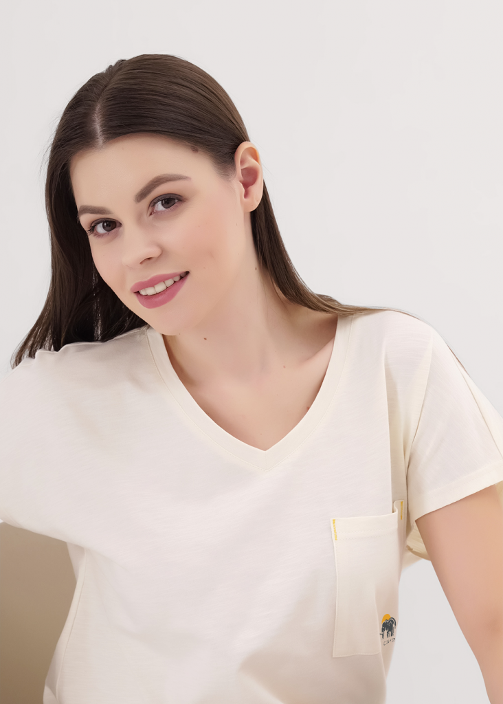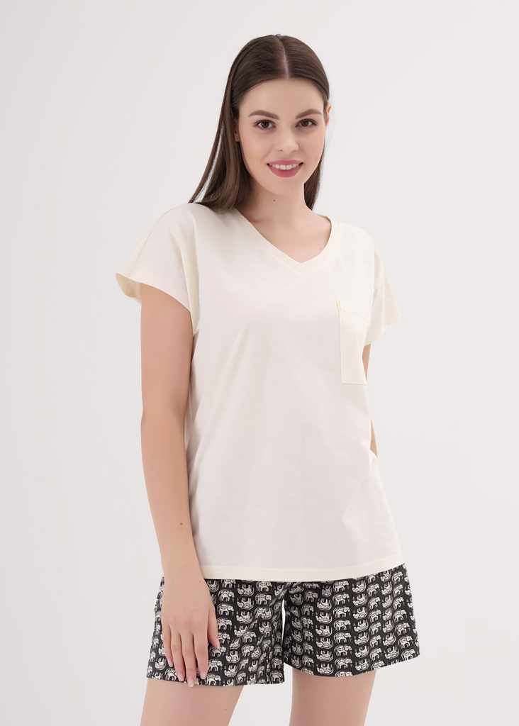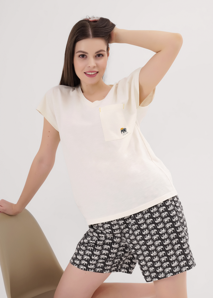 Набор одежды для дома и отдыха из трикотажного полотна. Футболка прямого кроя, горловина с обтачкой. Короткий целькроенный рукав. Спереди накладной карман с принтом вспенка. Шорты с поясом на резинке и киперной лентой. Боковые карманы с отрезным бочком.