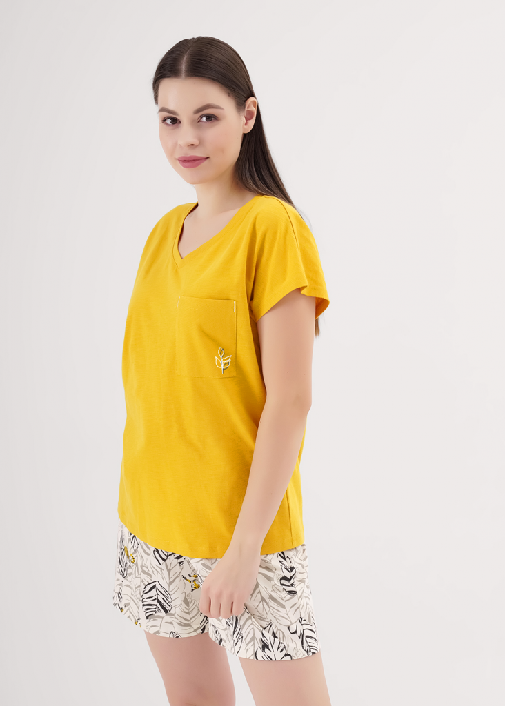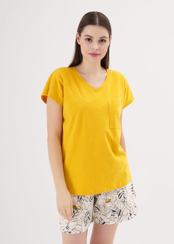 Набор одежды для дома и отдыха из трикотажного полотна. Футболка прямого кроя, горловина с обтачкой. Короткий целькроенный рукав. Спереди накладной карман с принтом вспенка. Шорты с поясом на резинке и киперной лентой. Боковые карманы с отрезным бочком.