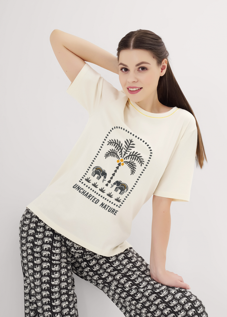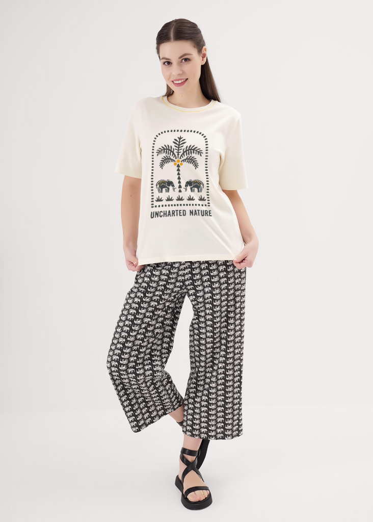 Набор одежды из трикотажного полотна.Футболка прямого кроя,по горловине обтачка с контрастным цепным стежком.Короткий втачной рукав,внизу вышивка.Спереди принт со вспенкой. По бокам разрезы. Бриджы на резинке с киперной лентой. Карманы с отрезным бочком.