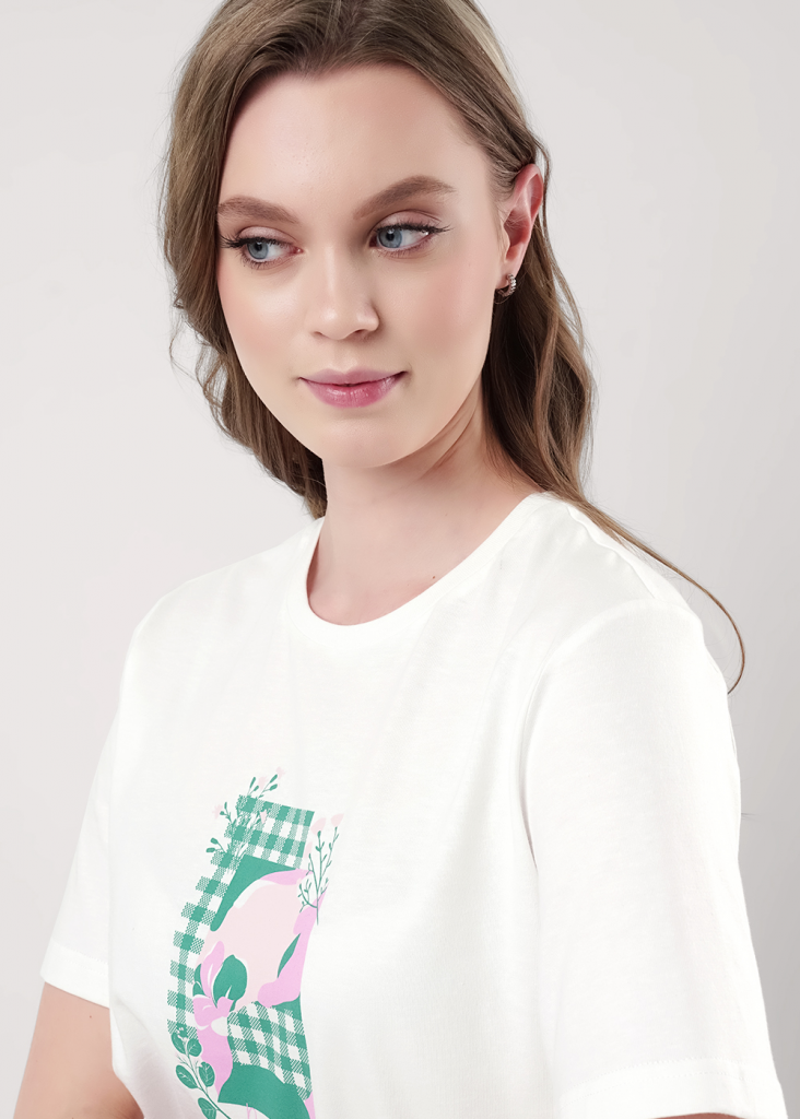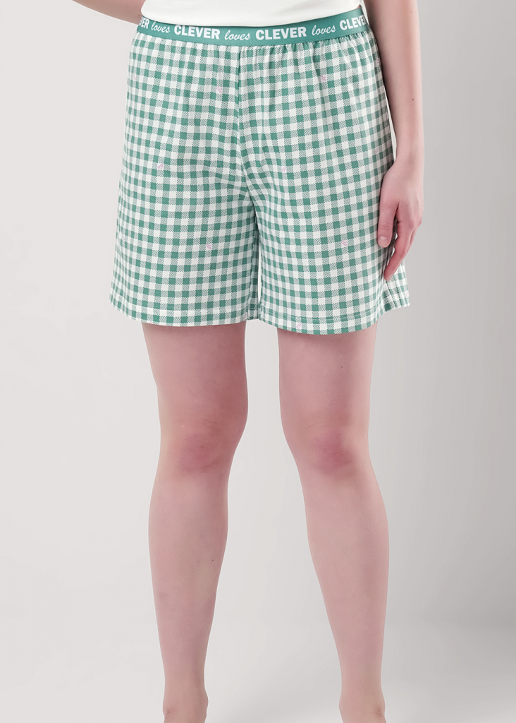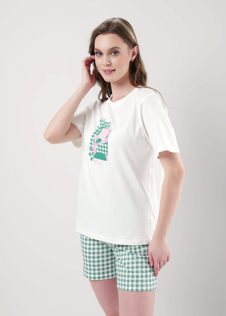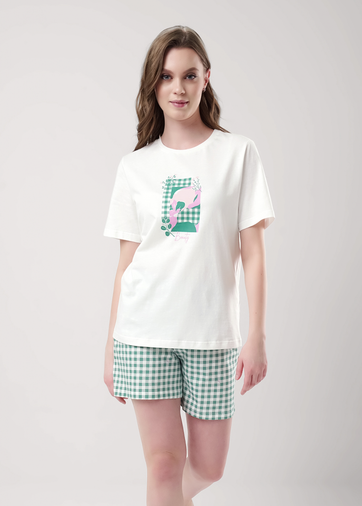 Пижама для дома из хлопкового трикотажного полотна. Футболка прямого силуэта, втачной короткий рукав. Округлая горловина с обтачкой. Спереди принт. Шорты свободные на поясе из жаккардовой резинки.