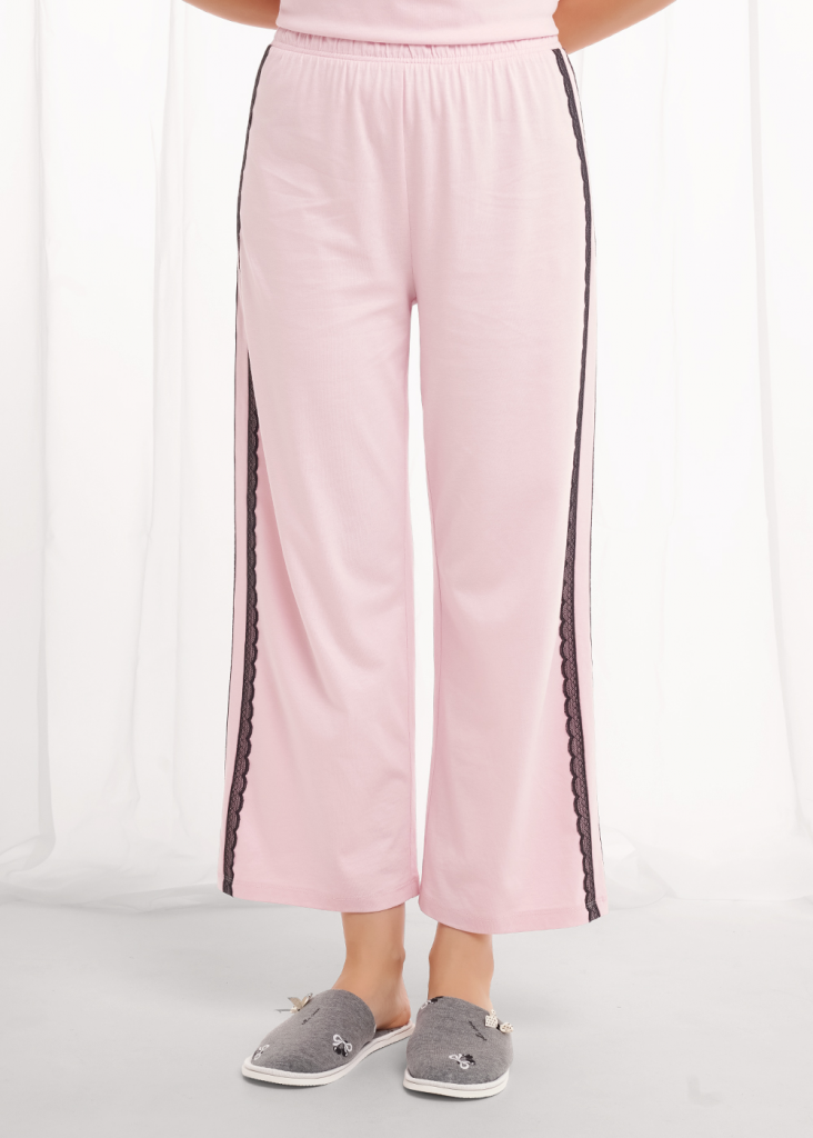 Набор одежды из хлопкового трикотажного полотна с модалом. Футболка прямого кроя. Короткий спущенный рукав. По горловине обтачка с кружевом. Спереди нашивка, сзади принт. Брюки прямые с поясом на внутренней резинке. По боковым швам узкое кружево, 2 ряда.