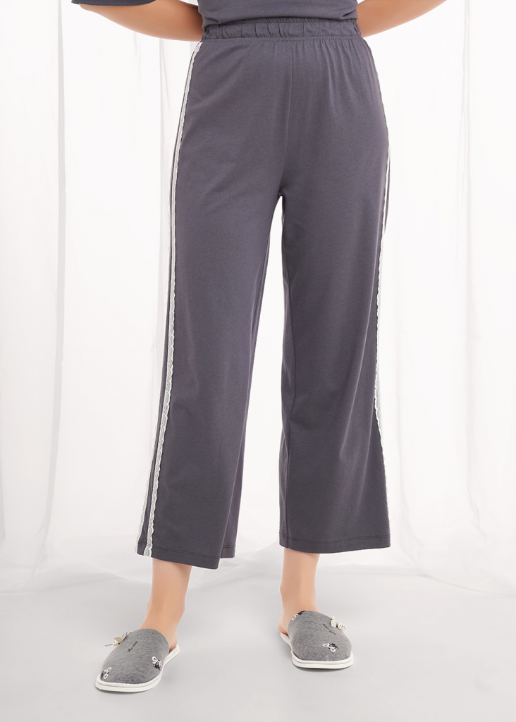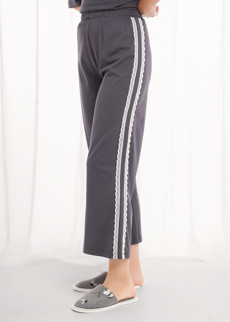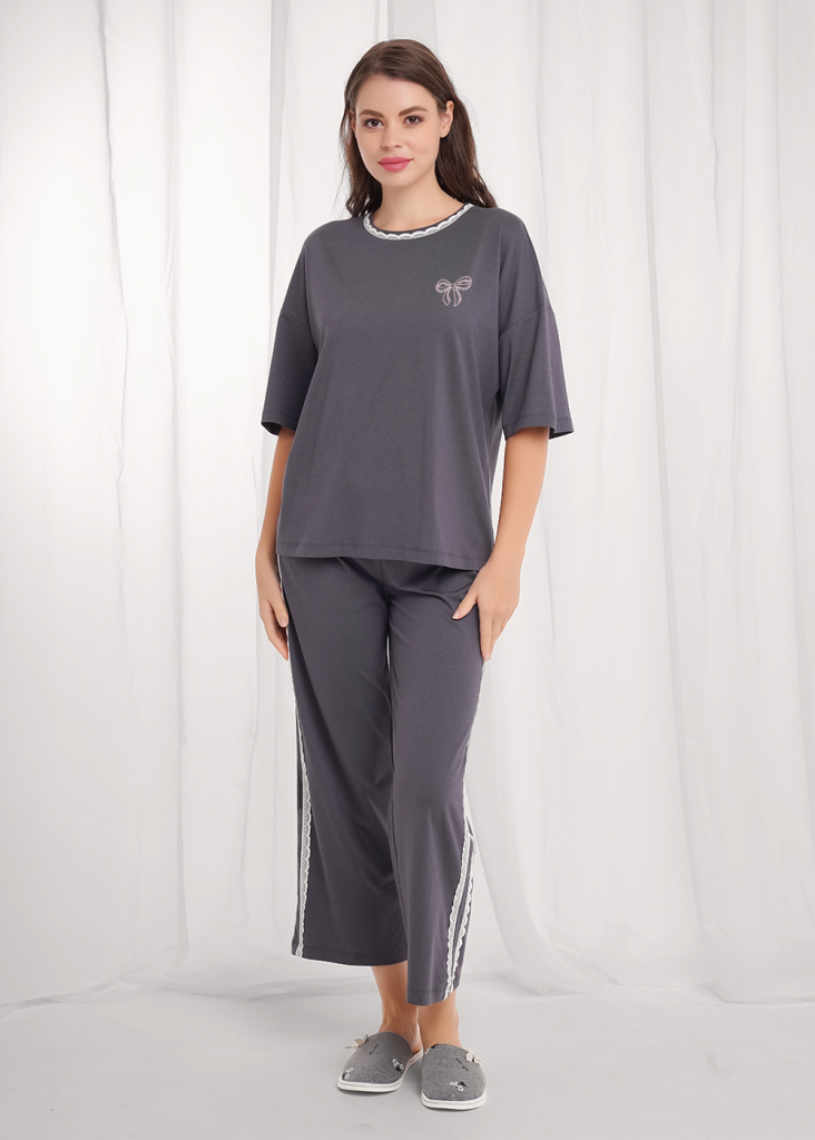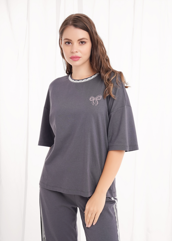 Набор одежды из хлопкового трикотажного полотна с модалом. Футболка прямого кроя. Короткий спущенный рукав. По горловине обтачка с кружевом. Спереди нашивка, сзади принт. Брюки прямые с поясом на внутренней резинке. По боковым швам узкое кружево, 2 ряда.