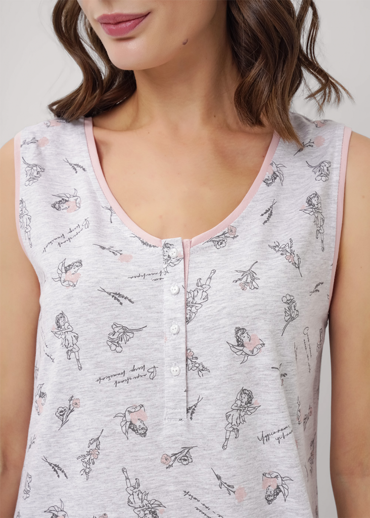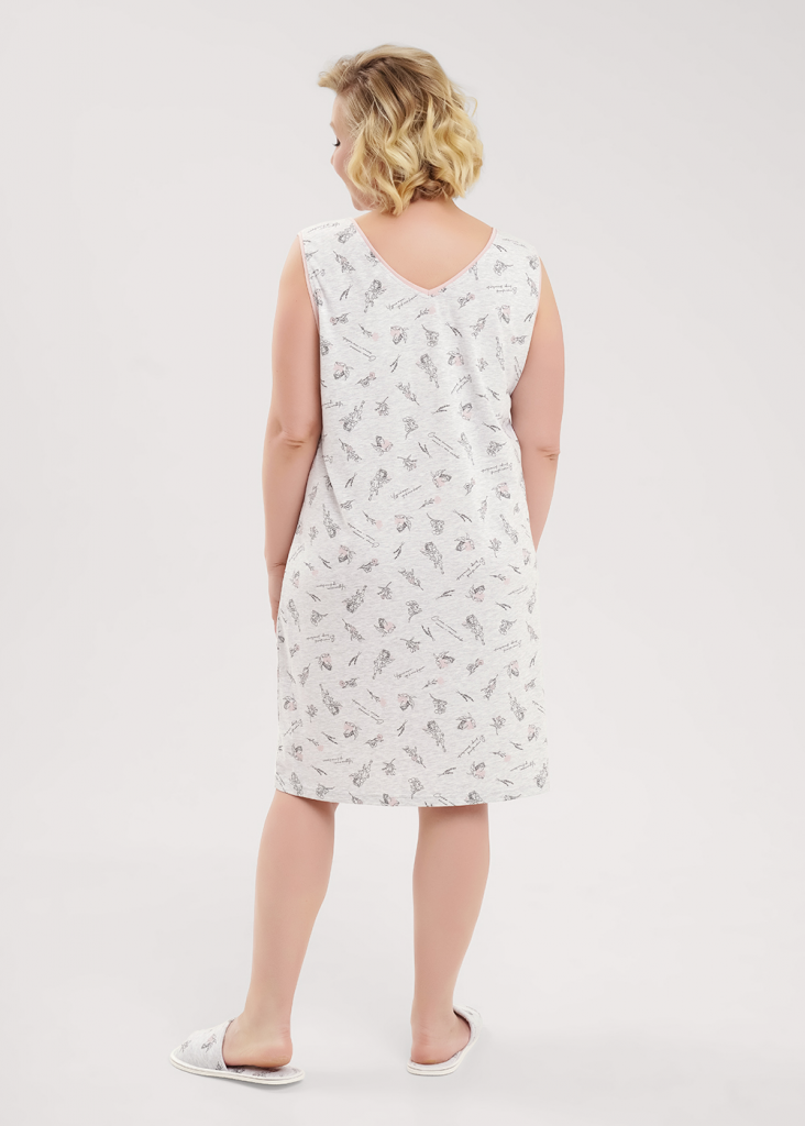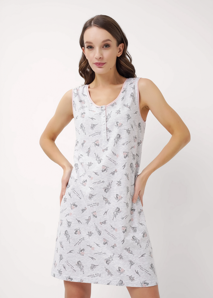 Ночная сорочка А-образного силуэта, из трикотажного полотна без рукавово. V-образная горловина, средняя ширина плеча. По горловине и пройме контрастная обтачка. По переду притачная планка с застежкой на пуговицы.