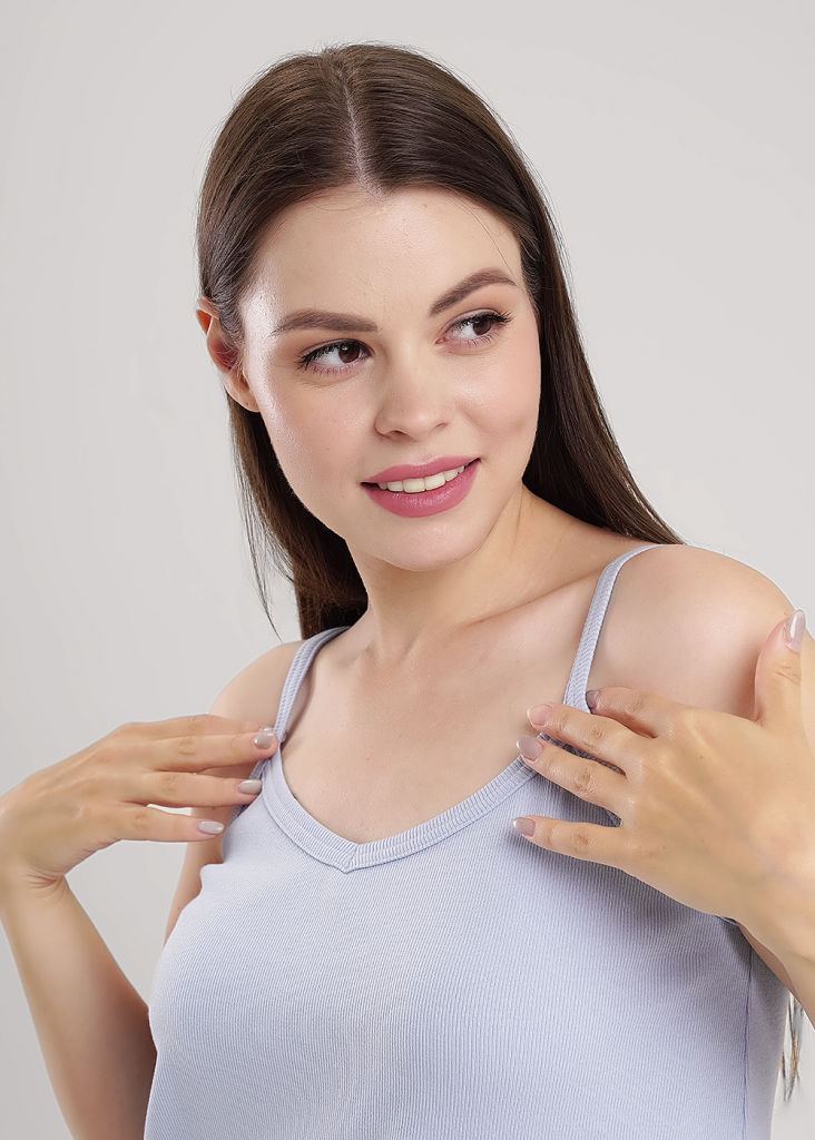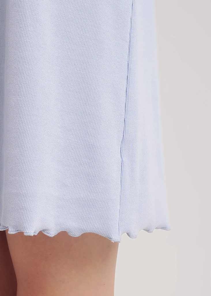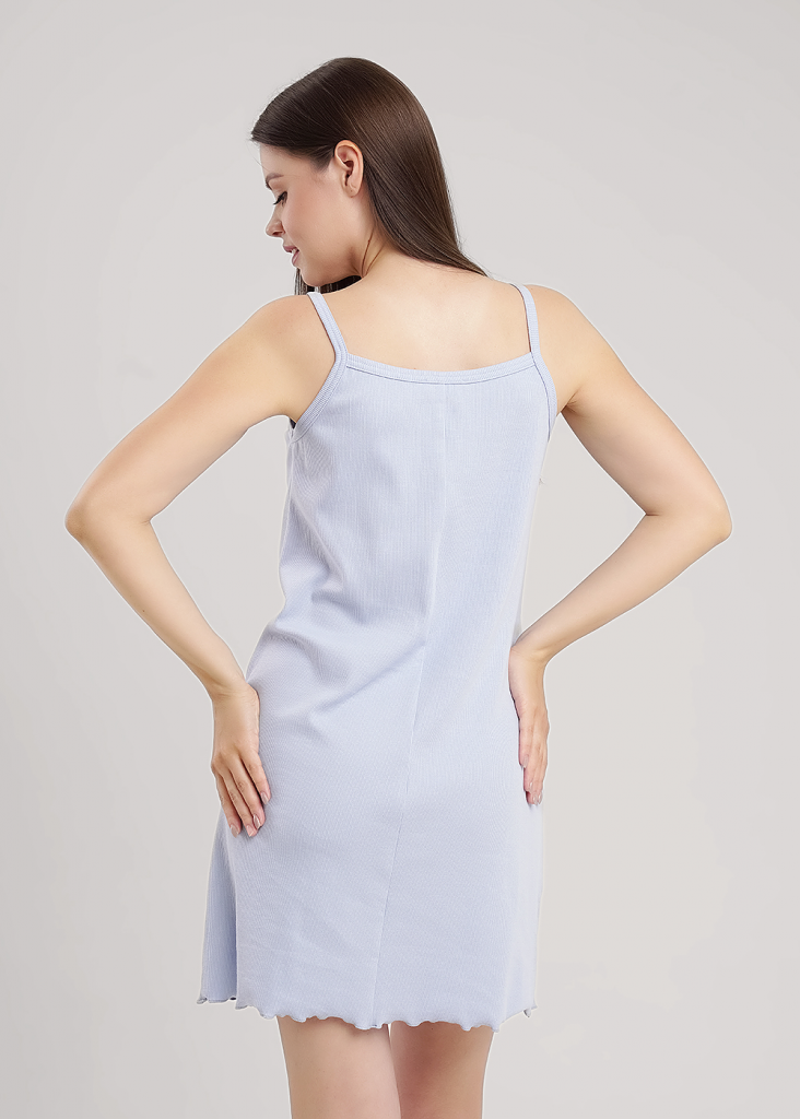Сорочка ночная А-образного силуэта из трикотажного полотна кашкорсе лапша. Длиной чуть ниже колена, на узких бретелях. По горловине и пройме окантовка. По низу изделия мелкий оверлок.