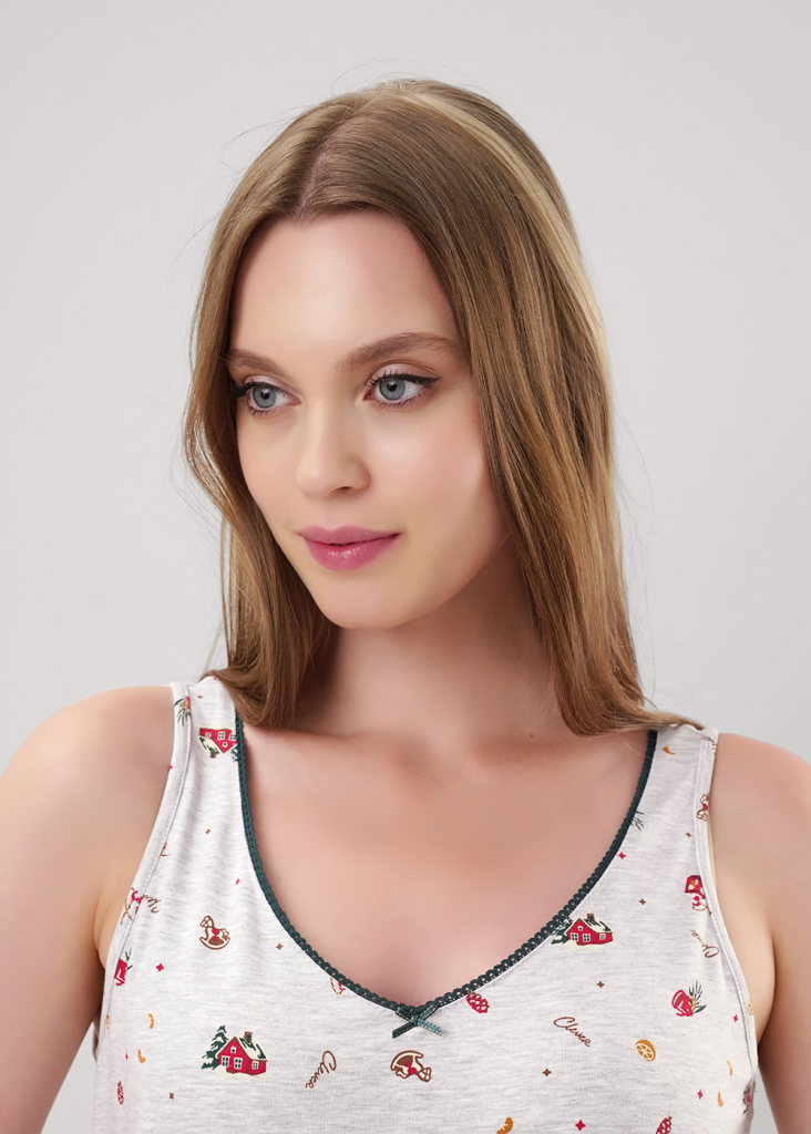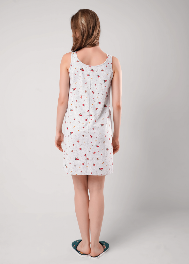 Сорочка ночная из хлопкового трикотажного полотна с эластаном, прямого силуэта на бретелях. По горловине ажурная резинка, бант. По пройме окантовка. По спинке средний шов.