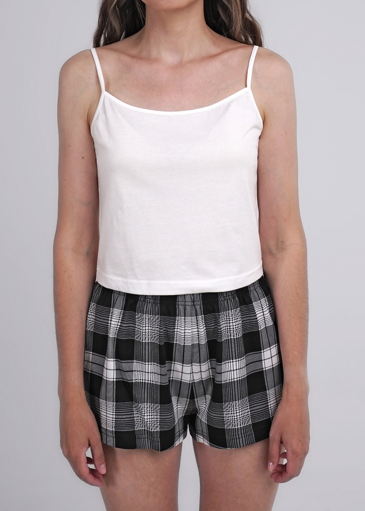 Пижама для дома из хлопкового трикотажного полотна. Майка прямого силуэта, на узких бретелях. По горловине и пройме окантовка. Короткие шорты свободного кроя, цельнокроеный пояс на внутренней резинке.