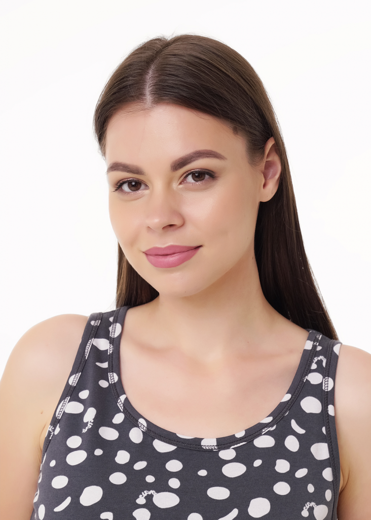 Пижама для дома из хлопкового трикотажного полотна с эластаном.Майка прямого силуэта, среднее плечо.По горловине и пройме окантовка с застилом, внизу нашивка.Короткие шорты с притачным поясом на внутренней резинке,спереди имитация гульфика с пуговицами.
