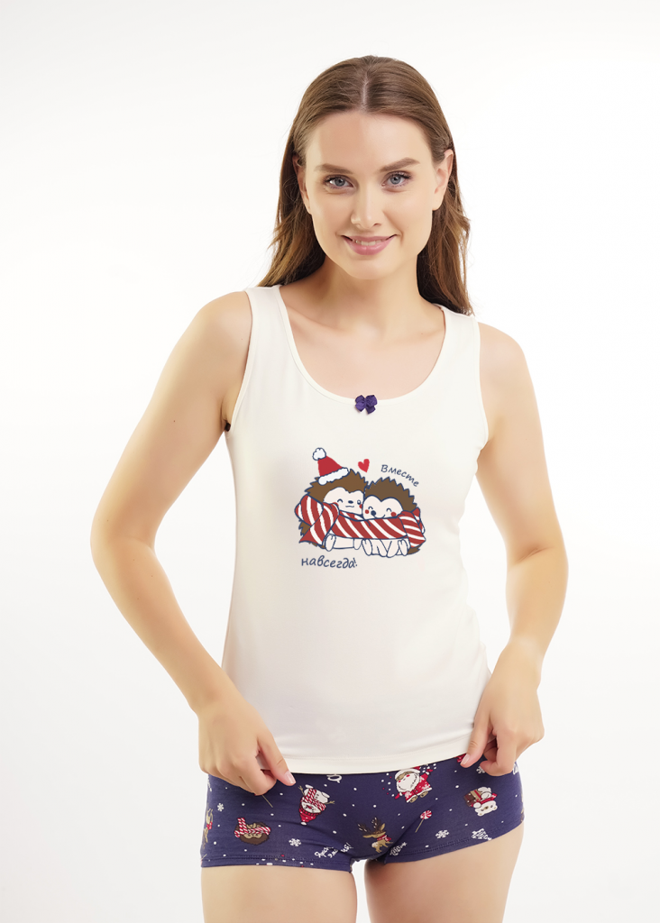 Набор одежды для дома из трикотажного полотна с добавлением эластана. Майка умеренного объема. Узкая бретель, округлая горловина. По горловине и пройме окантовка. Спереди принт. Короткие шорты свободного кроя, пояс на внутренней резинке. Спереди бант.