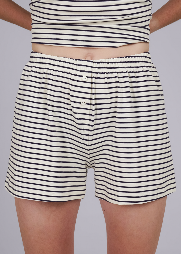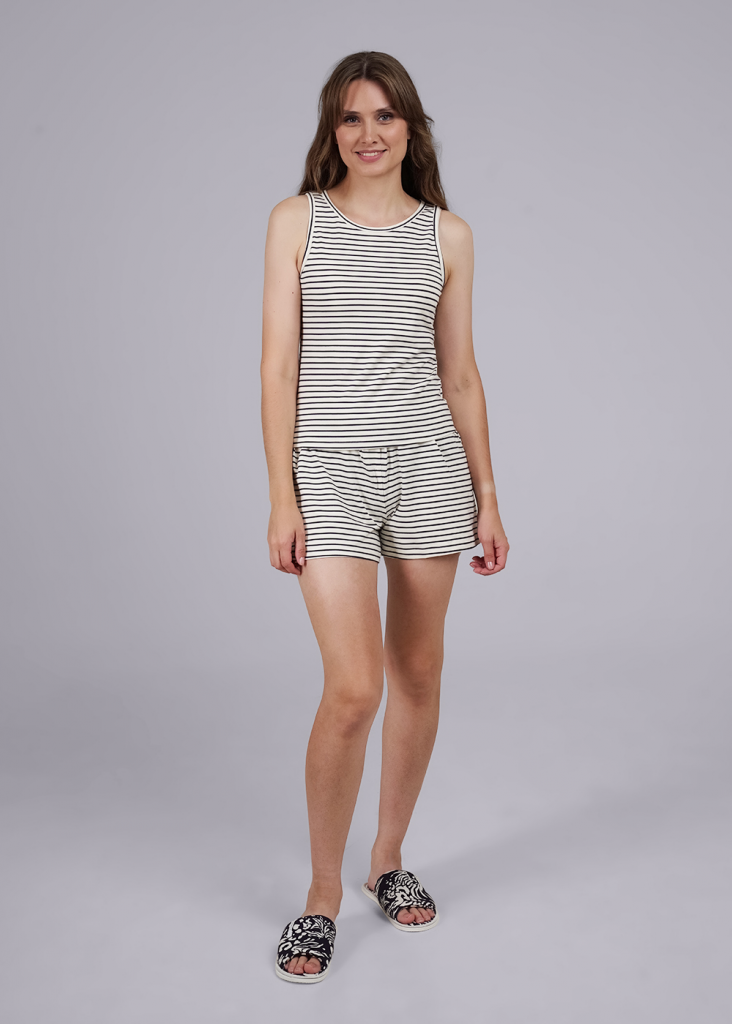 Пижама для дома из эластичного хлопкового полотна. Майка умеренного объема. Узкая бретель, округлая горловина,по горловине,пройме окантовка. Короткие шорты свободного кроя, цельнокроеный пояс на внутренней резинке. Спереди имитация гульфика.