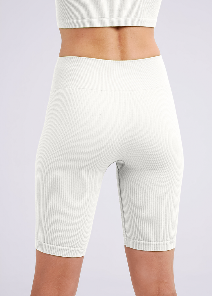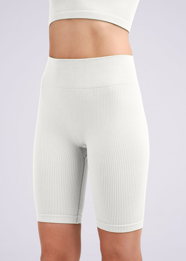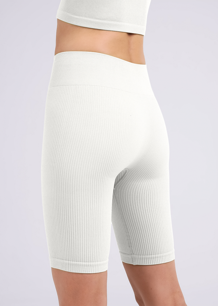 Женские шорты в рубчик с высокой посадкой. По талии широкая резинка, обеспечивающая комфортную посадку.