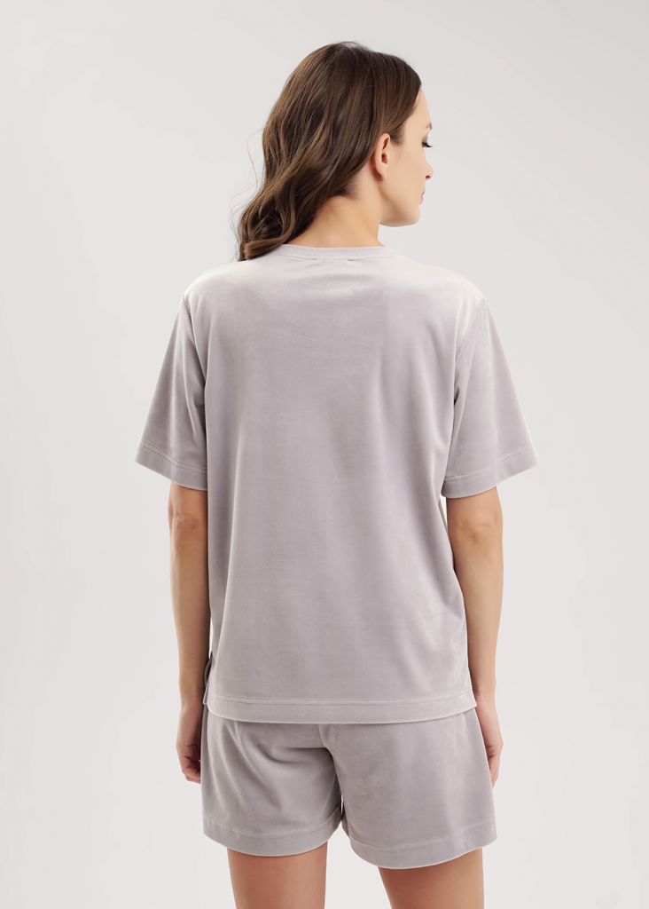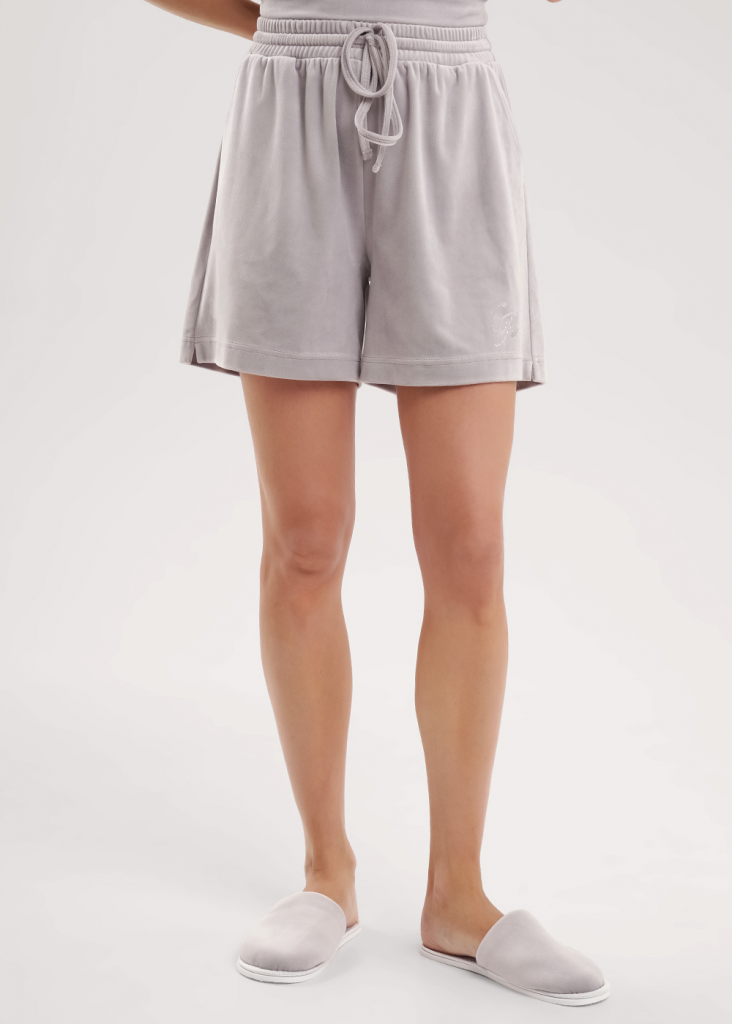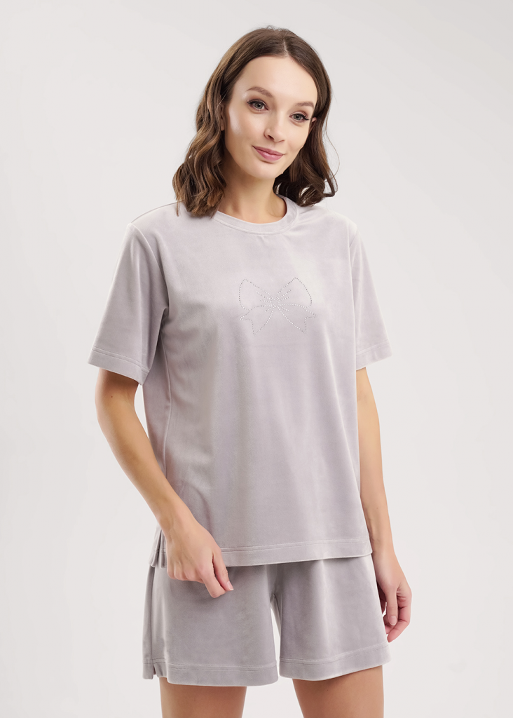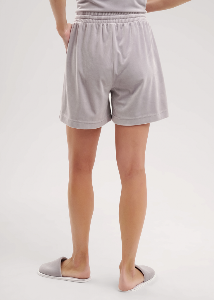 Шорты для дома и отдыха из трикотажного полотна велюр, умеренного объема. Притачной пояс на внутренней резинке со шнуром из окантовки. Боковые карманы с отрезным бочком. По бокам разрезы. стразы.