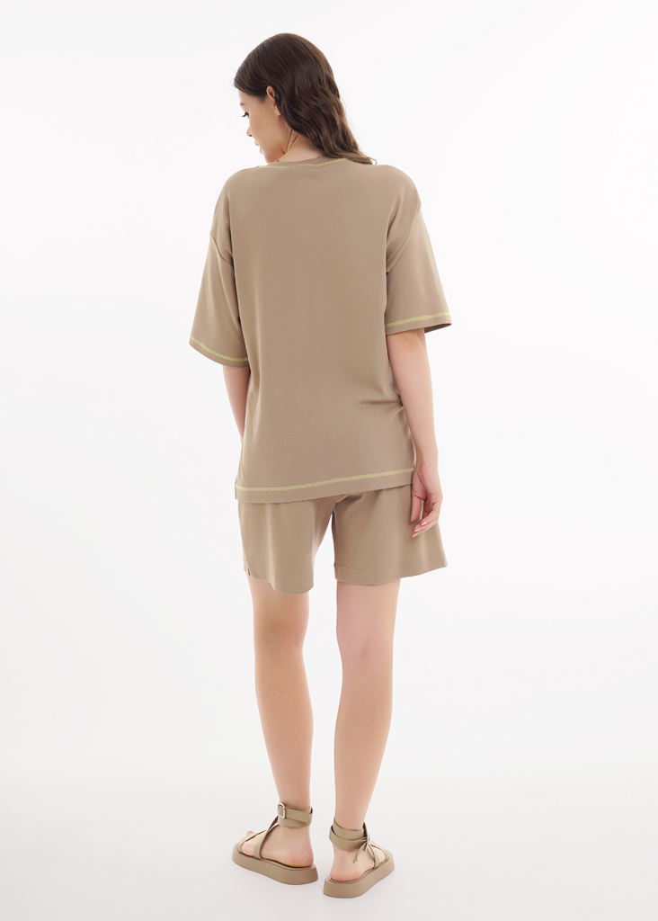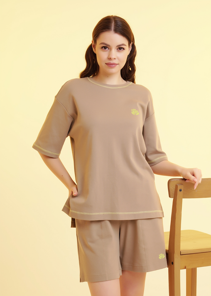 Шорты для дома и отдыха из трикотажного полотна интерлок, с притачным поясом на резинке. По переду вертикальные застилы, принт вспенка. Боковые карманы с отрезным бочком. Боковые разрезы.