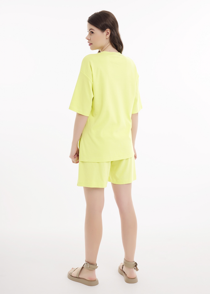 Шорты для дома и отдыха из трикотажного полотна интерлок, с притачным поясом на резинке. По переду вертикальные застилы, принт вспенка. Боковые карманы с отрезным бочком. Боковые разрезы.