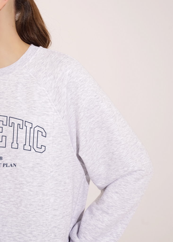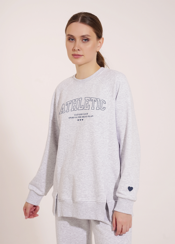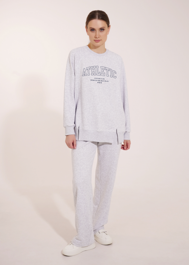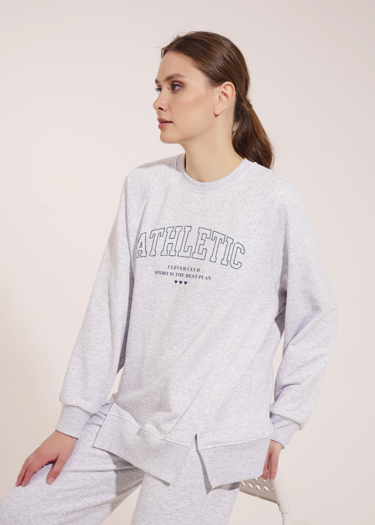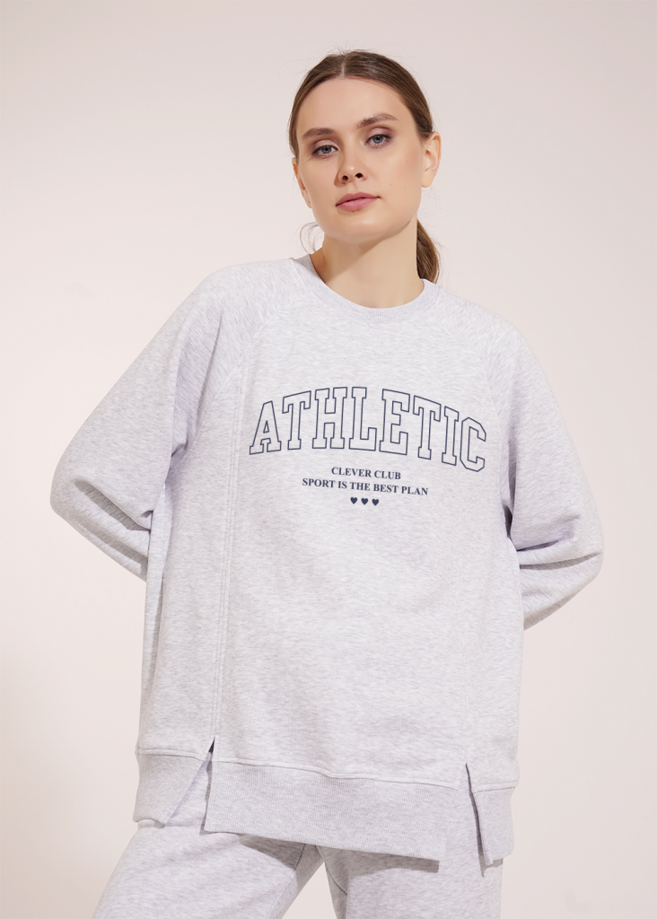 Джемпер спортивный из трикотажного полотна футер, свободного кроя. Округлая горловина с обтачкой. По переду резы с разрезами. Длинный рукав реглан, внизу нашивка. По низу рукава и изделия манжеты. Спереди принт.