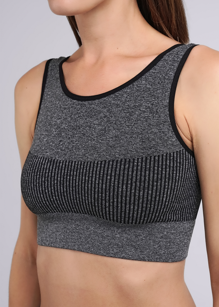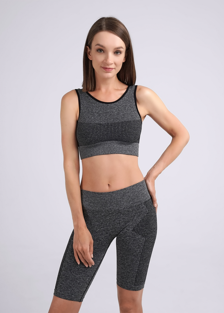 Женская укороченная майка из микрофибры с широкой бретелью. Майка с глубоким круглым вырезом. В области груди вывязан рубчик, обеспечивающий хорошую поддержку.