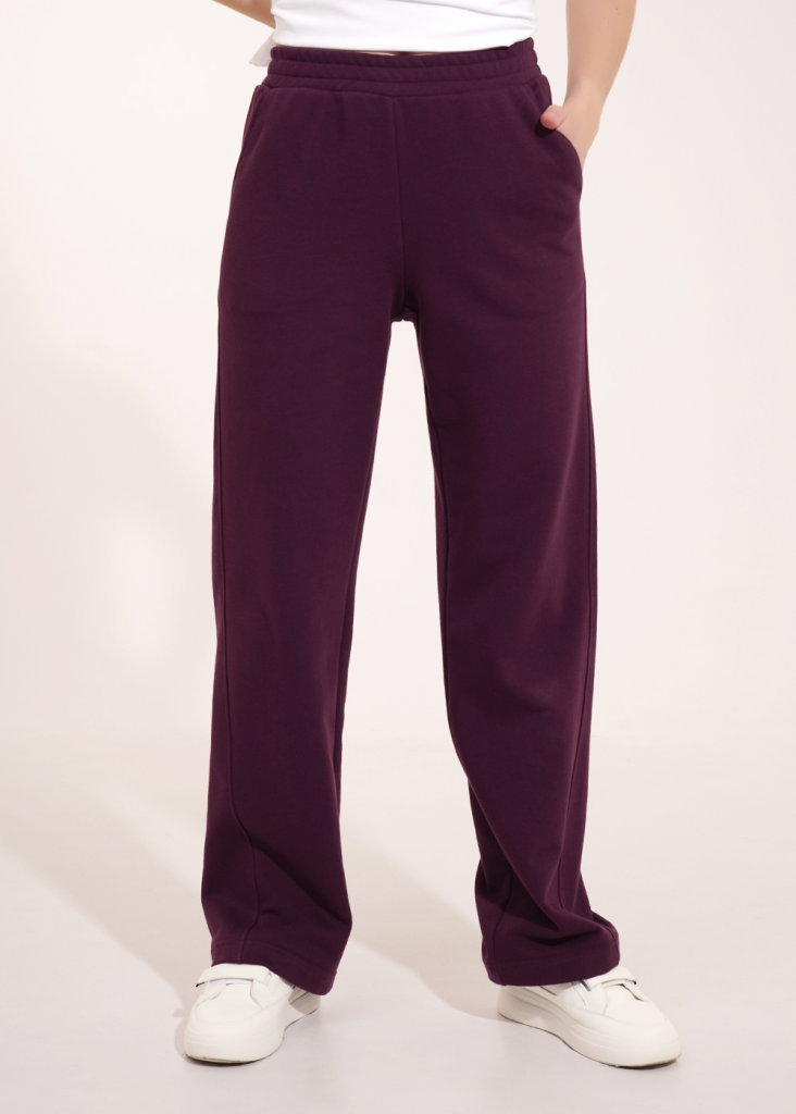 Брюки прямые спортивные из трикотажного полтна футер. По талии притачной пояс на внутренней резинке. Боковые карманы с отрезным бочком. Боковые швы переходят на перед.