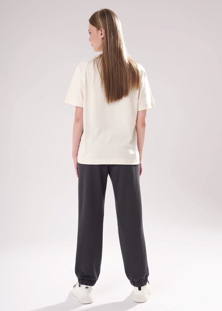 Брюки спортивные из трикотажного полотна футер с начесом,зауженные книзу. По талии пояс на резинке и внутренним шнуром. По низу брюк подгибка с внутренней резинкой. Боковые карманы с отрезным бочком.