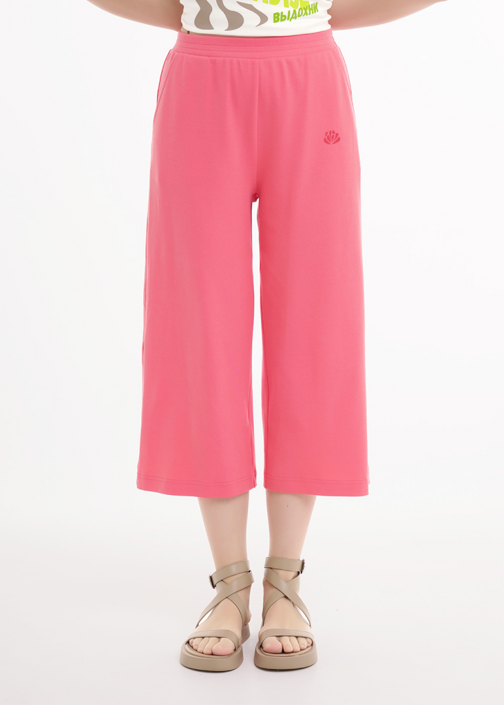 Брюки широкие для дома и отдыха из трикотажного полотна интерлок, с притачным поясом на резинке. Боковые карманы с отрезным бочком, принт вспенка.