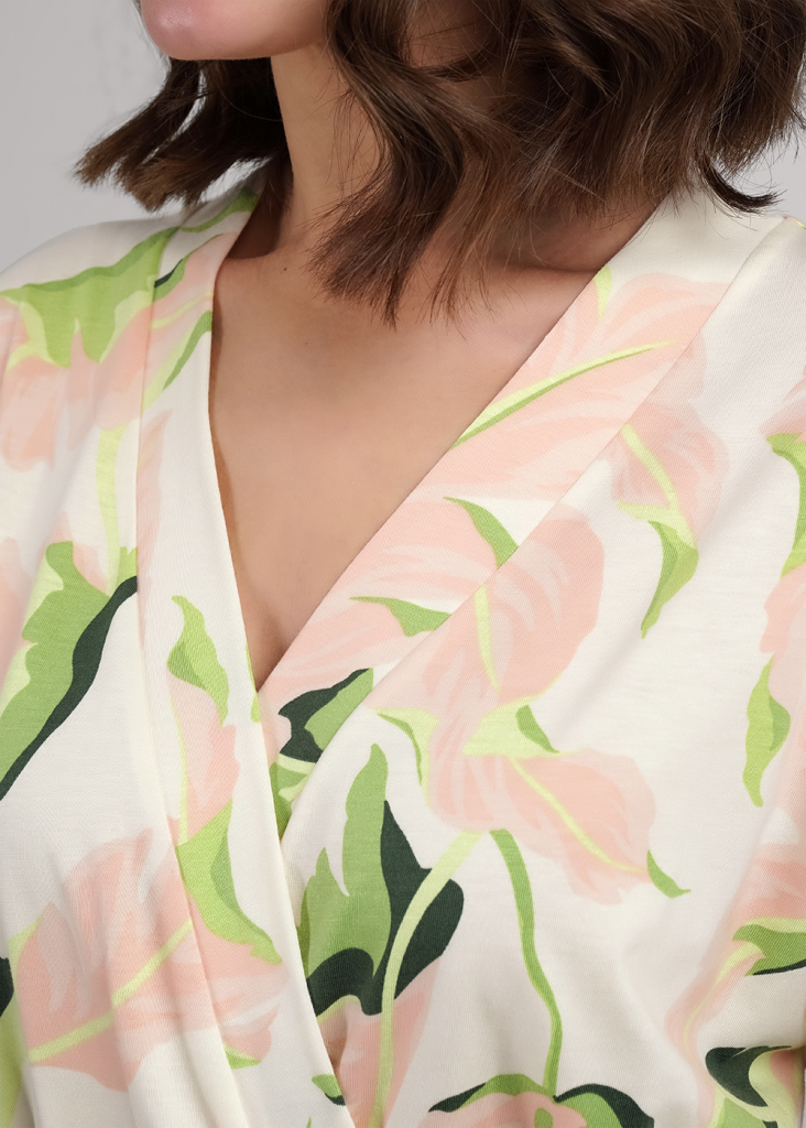 Халат для дома и отдыха на запах с поясом, из хлопкового трикотажного полотна с добавлением модала. Рукав длиной 3/4 со спущенной линией плеча. По горловине и борту полочек обтачка.