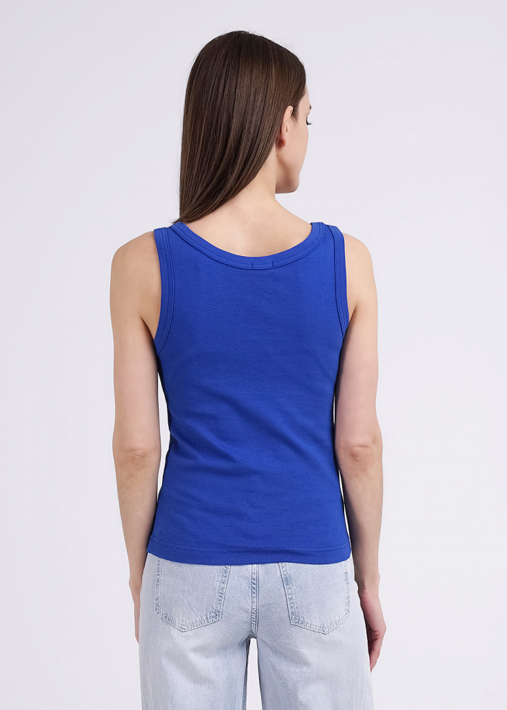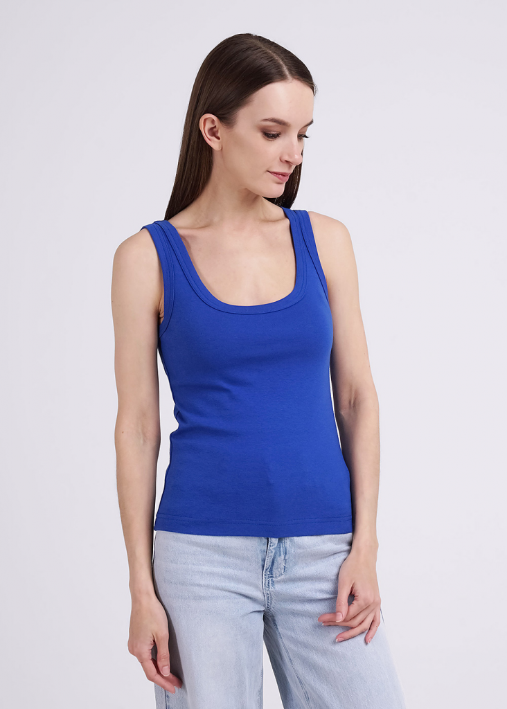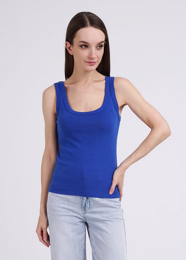 Майка из хлопкового трикотажного полотна рибана. Умеренный объем. Широкая бретель, округлая горловина. По горловине и пройме окантовка.