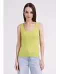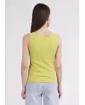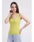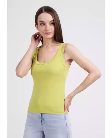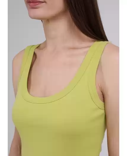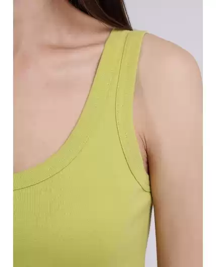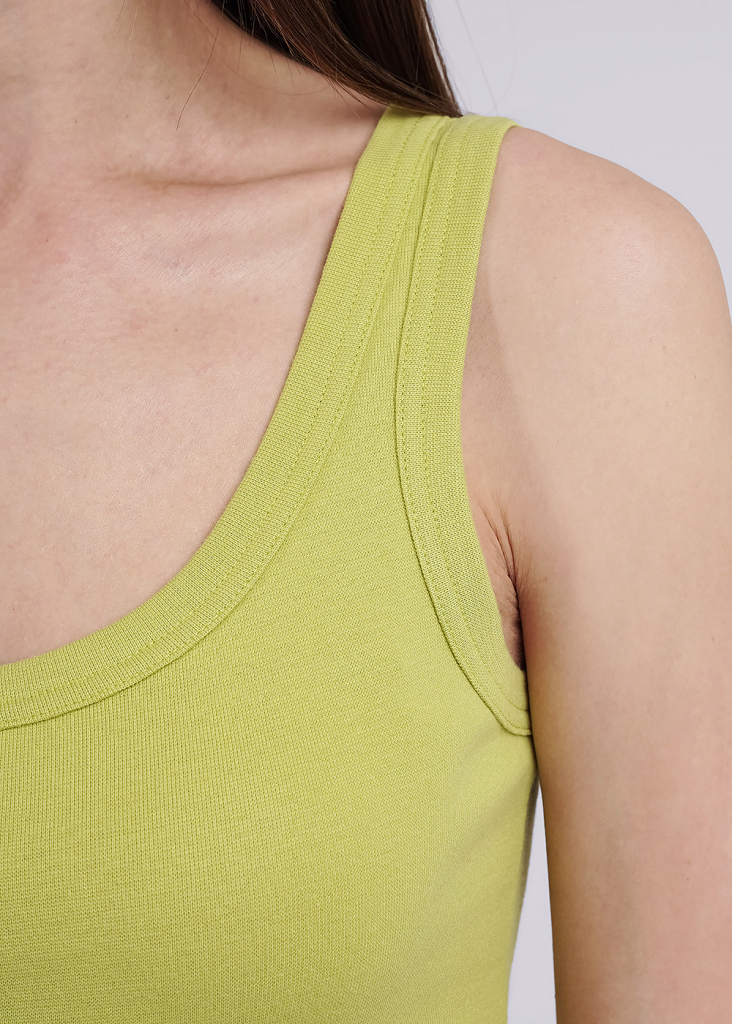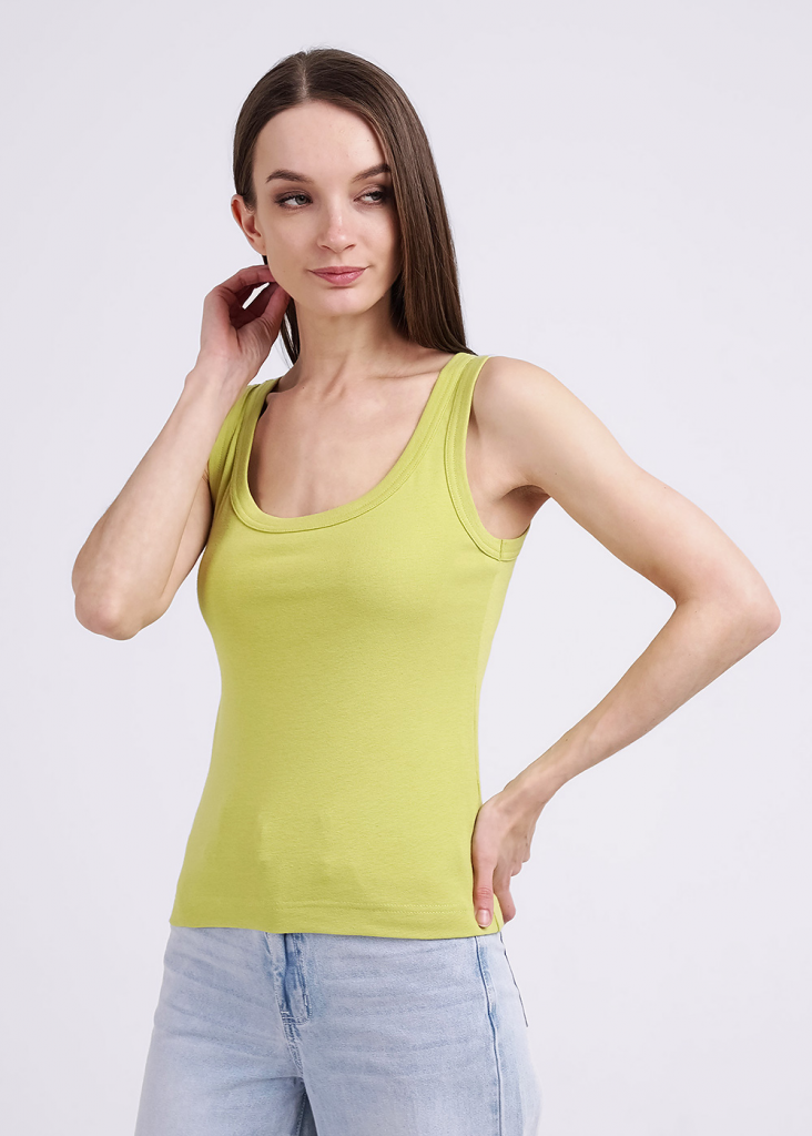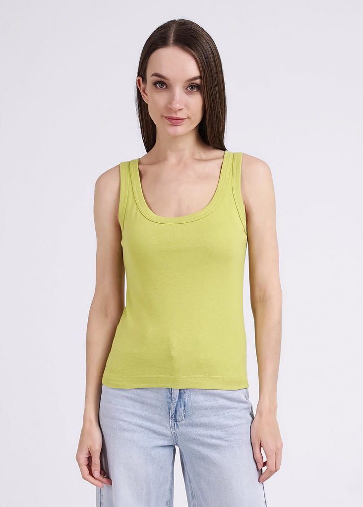Майка из хлопкового трикотажного полотна рибана. Умеренный объем. Широкая бретель, округлая горловина. По горловине и пройме окантовка.
