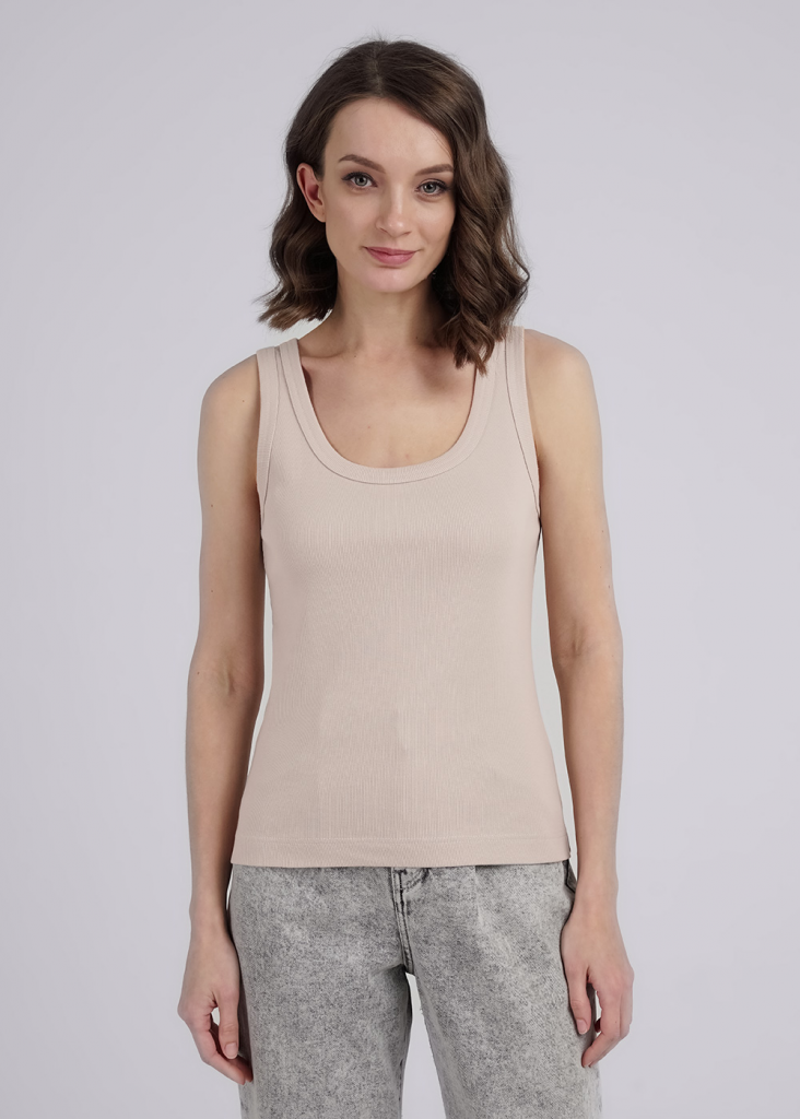 Майка из хлопкового трикотажного полотна рибана. Умеренный объем. Широкая бретель, округлая горловина. По горловине и пройме окантовка. Производство Узбекистан.