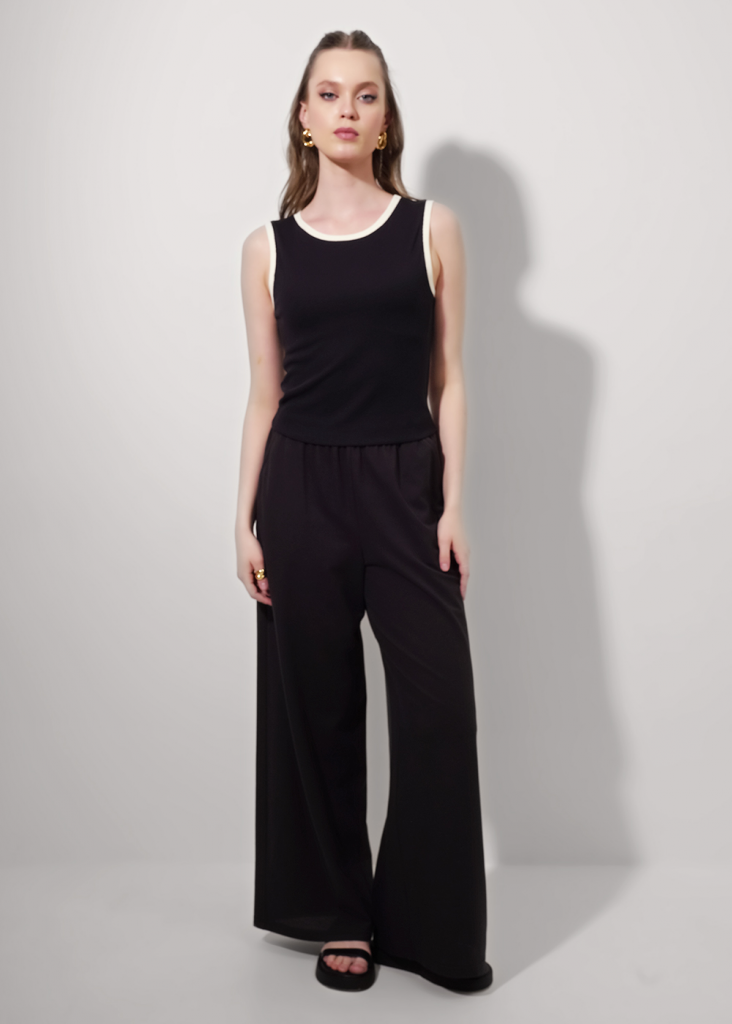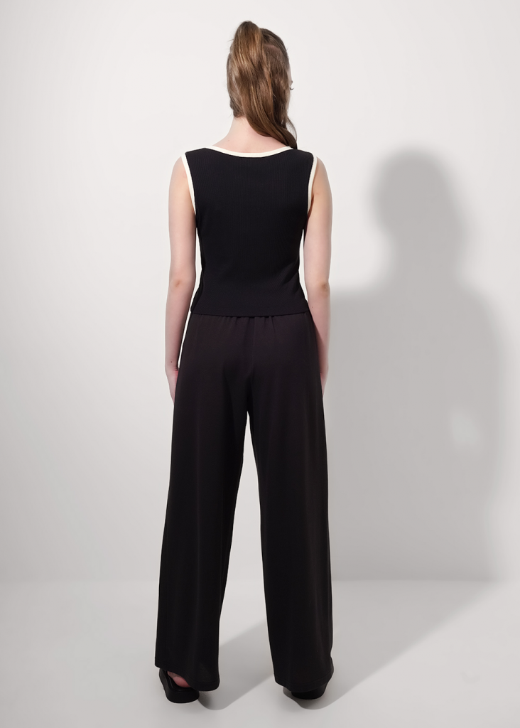 Майка из трикотажного полотна кашкорсе. Средняя ширина плеча. Округлая горловина. По горловине и пройме контрастная обтачка.